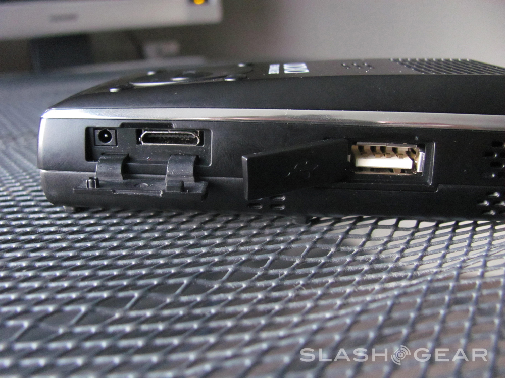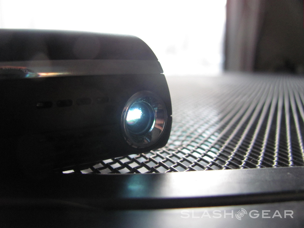 If you take a look back at our original post announcing availability of this projector, you'll see that this device is a three-color laser light source projector, one they call "revolutionary." It also includes proprietary despeckling technology, and an LCoS imager to produce 800 x 600 resolution and 20 lumen output. It has a built-in speaker, ports for VGA, A/V, USB, and power (for both charging and using whilst plugged in,) plus there's a headphone jack on the other side.