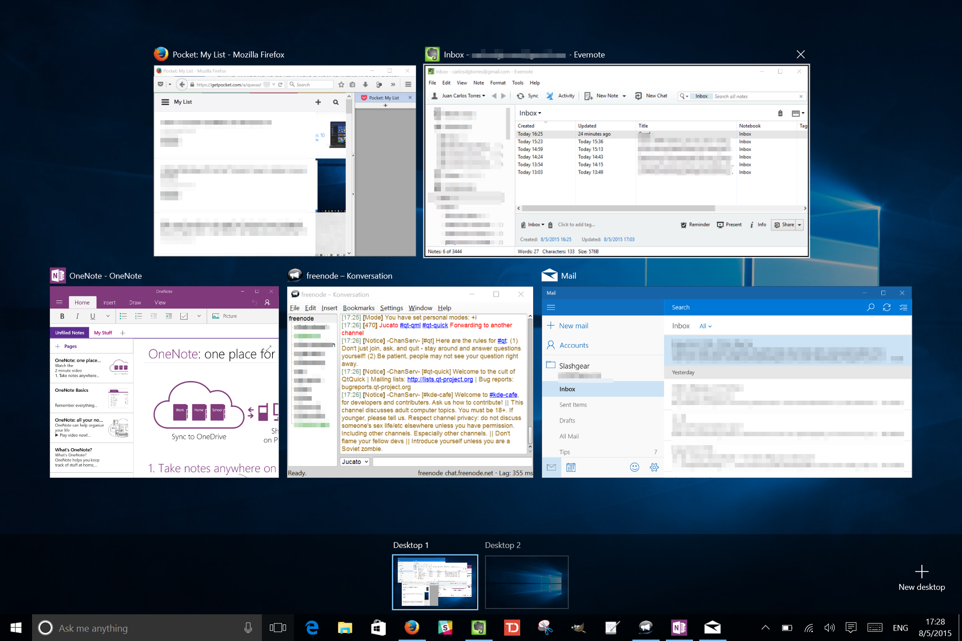 Windows finally gets a feature that Linux, and also recently OS X, has. Task View gives a more visual overview of the programs you have running more than what a simple Alt+Tab can do. Virtual Desktops allow you to seggregate Windows together into arbitrary groupings, like maybe a desktop for work, one for social apps, and the like. Admittedly, it falls under "power user" features, but it's a neat thing to have. Though hidden behind a Win+Tab shortcut (as opposed to the regular Alt+Tab), Microsoft wants you to know it's there as it puts the Task View button on the taskbar by default.