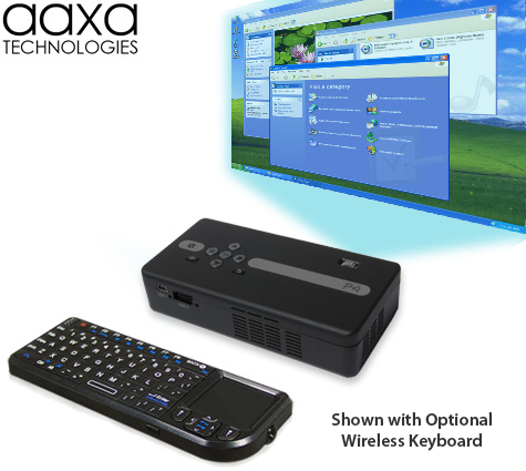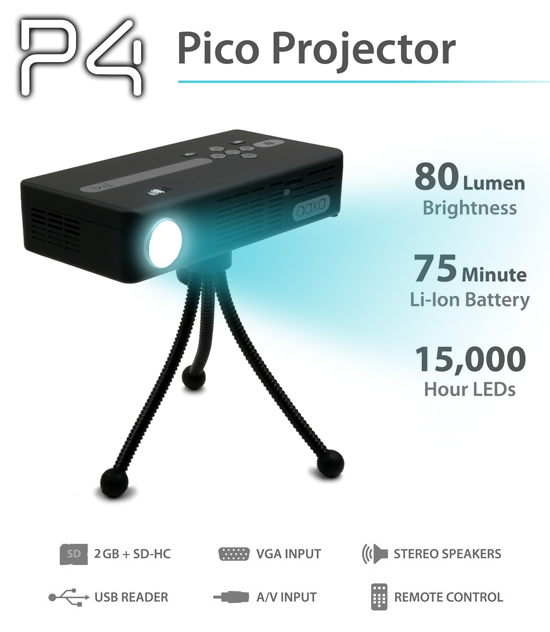 The AAXA P4 Pico Projector is powered by a 750MHz Windows CE mobile processor, and is plenty bright too. It gets an 80 lumen high-contrast optical engine by way of Texas Instruments DLP. It features AAXA's vibrant color technology and the LED should last for 15,000 hours. Some of the other specs that make the P4 special include: 2GB of built-in memory, 1280×800 VGA input, microSD slot for extra storage, composite video input, 1-watt speaker, 3.5mm headphone jack, 720p video support, and support for 3rd party apps like Office Mobile and other Windows CE apps.