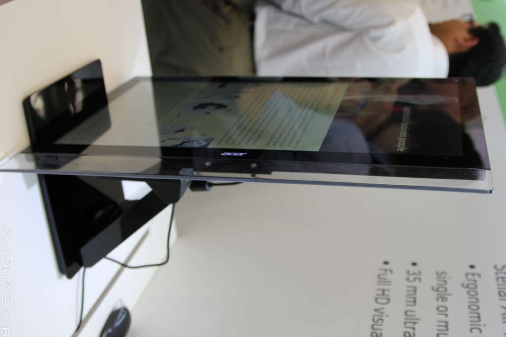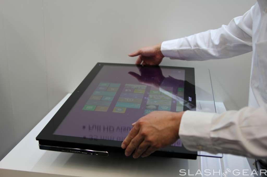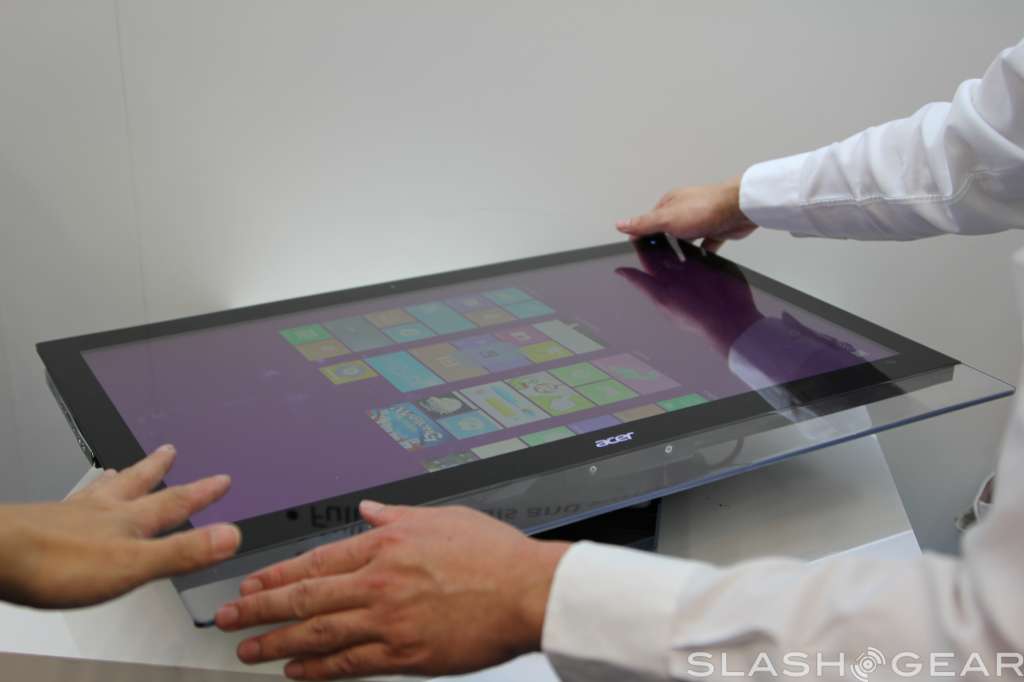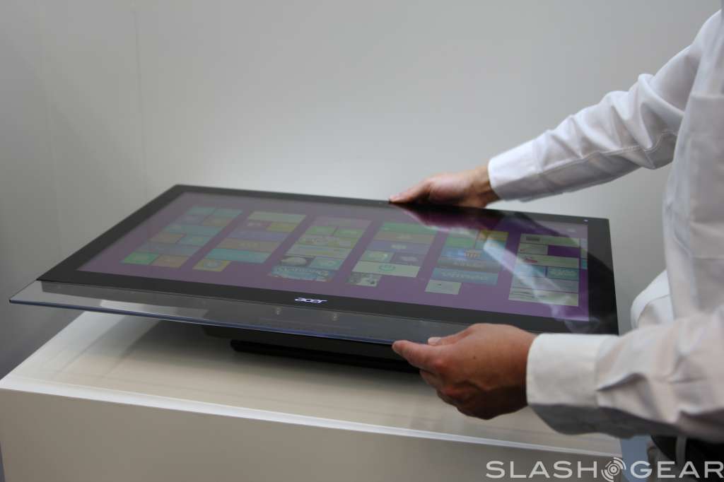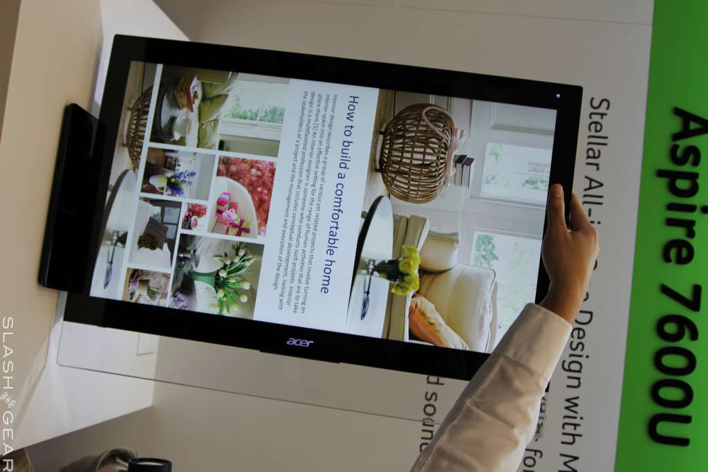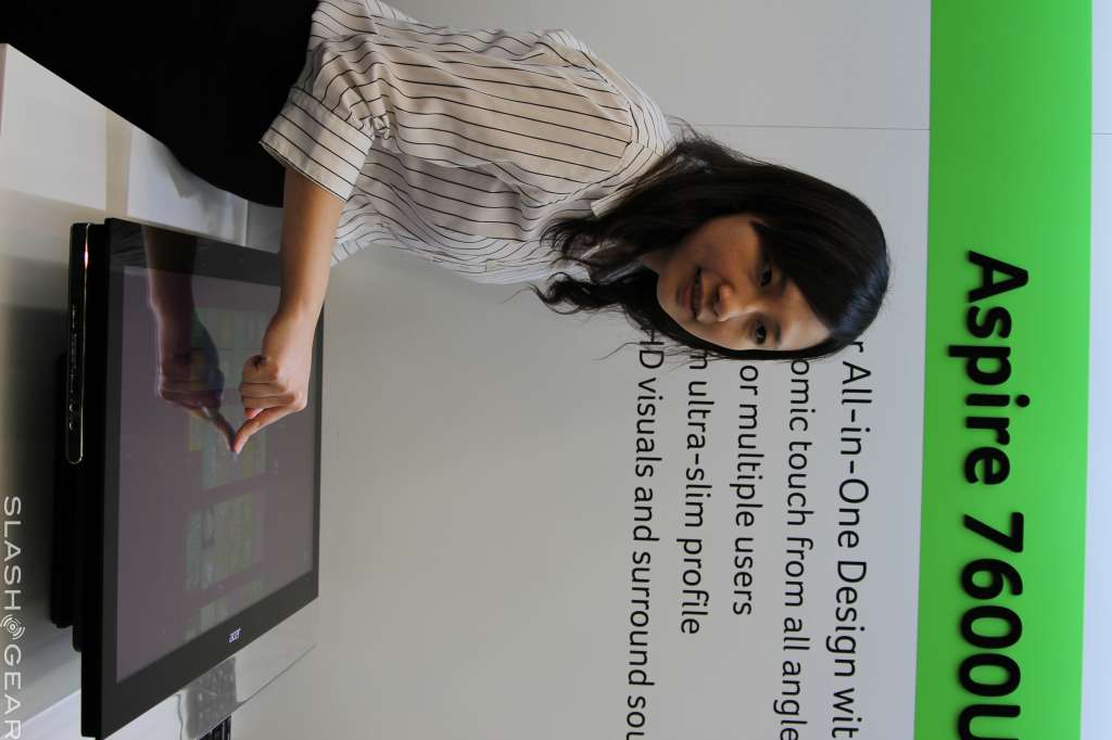 The 27-inch 7600U folds flat into a useful approximation of Microsoft's Surface multitouch table – with up to 64 fingers recognized simultaneously - though presumably a whole lot more affordable (Acer isn't talking pricing yet). The display is responsive and the hinge suitably sturdy to keep the tilt/swivel mechanism manageable.