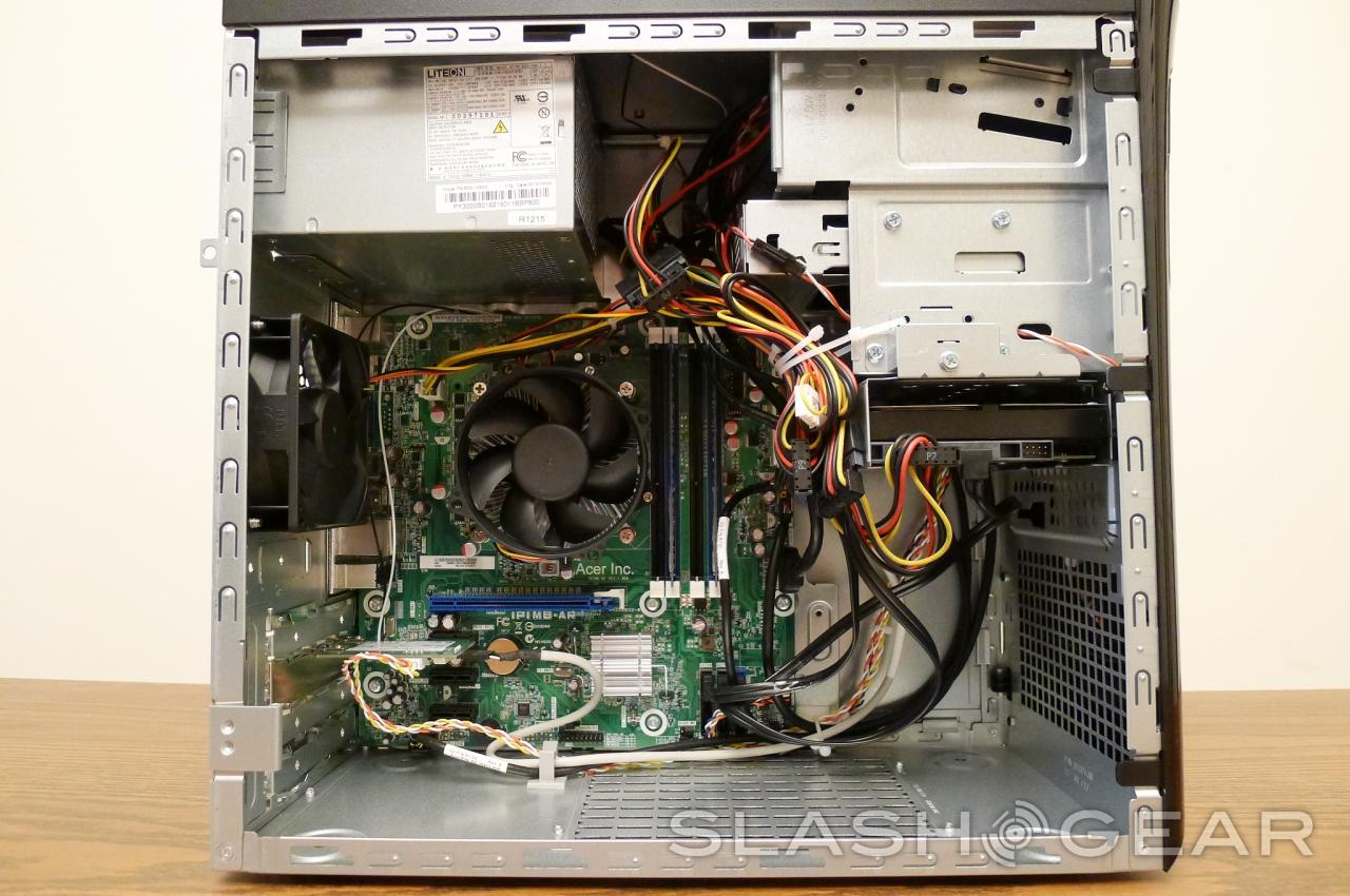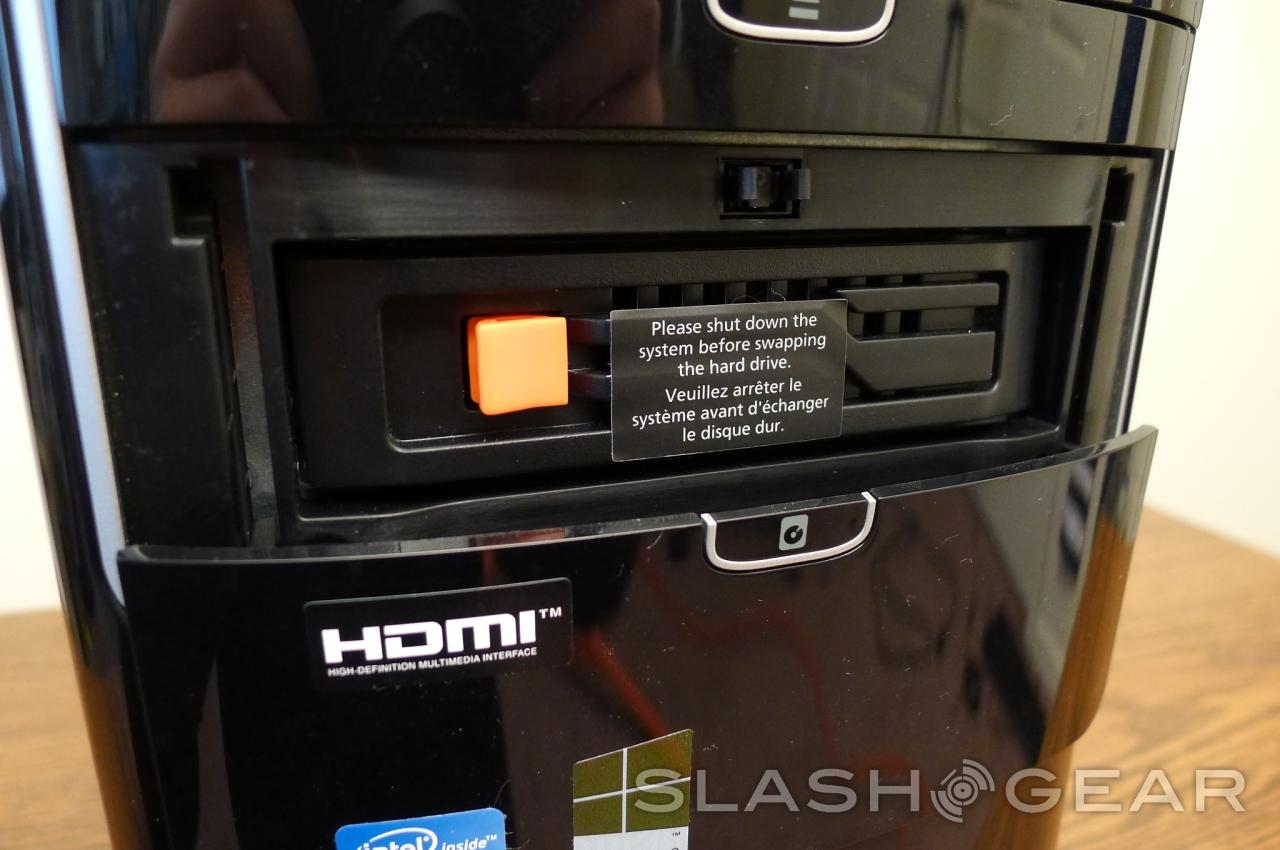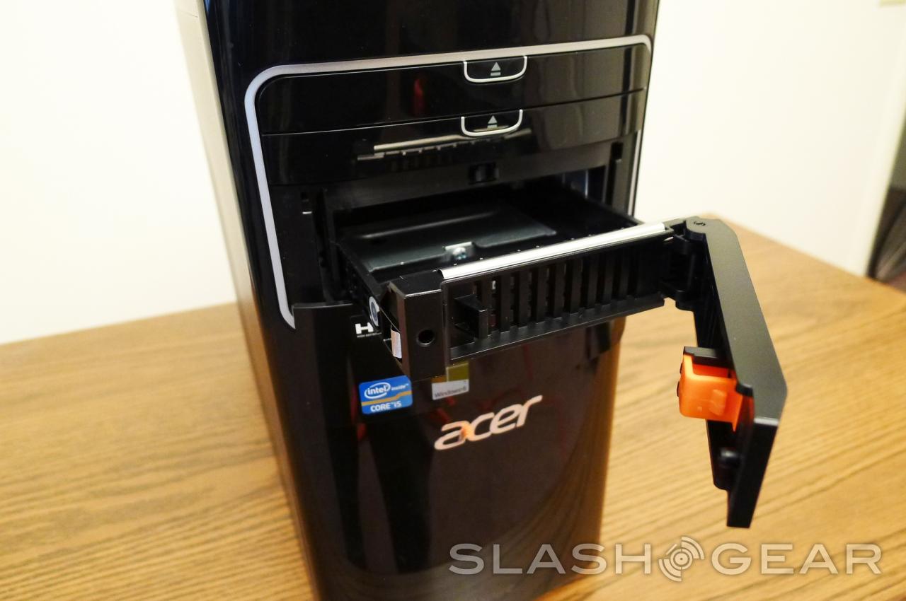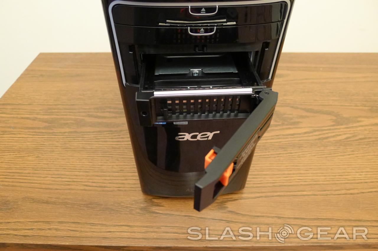 There's room for two optical drives on the front of the case, one of which is already occupied by a laptop-style DVD-RW drive. We're not sure why Acer included two spots for optical drives, especially in a world where even a single optical drive can be considered overkill. However, right below those two slots is a "hot-swappable" hard drive bay, that allows you to quickly change out hard drives without opening up the computer and getting your hands dirty. However, the drive bay isn't technically hot-swappable, since you have to turn the computer off before messing around with it — not exactly ideal, but a dedicated drive bay like this will certainly turn heads.