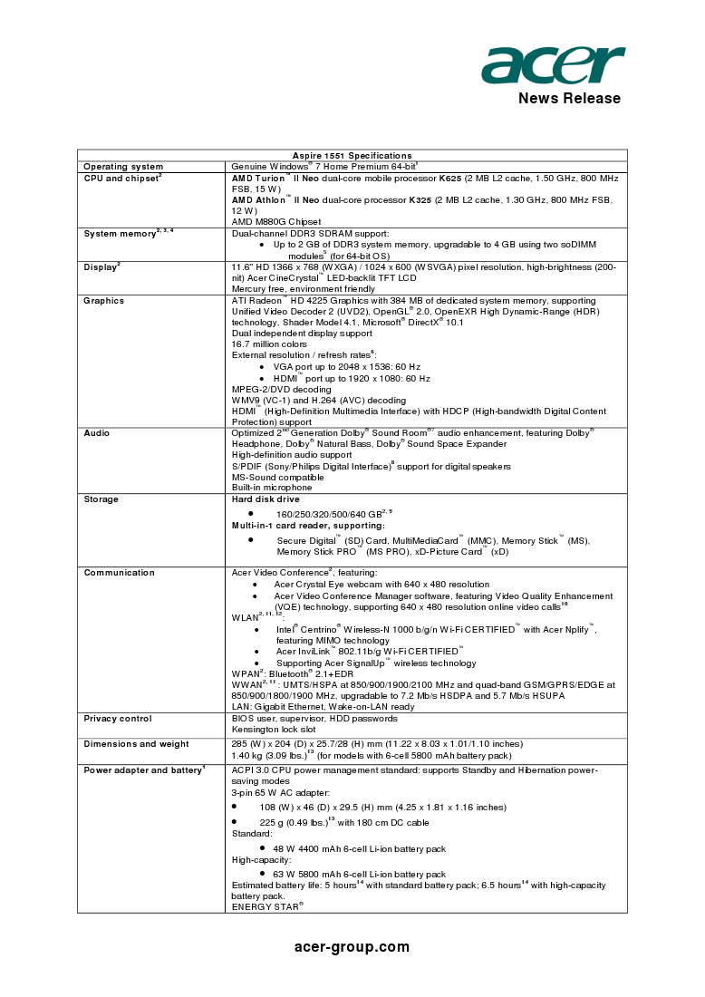 Finally, turning to the Acer Aspire 1551, that has an 11.6-inch 1366 x 768 display, HDMI output for 1080p HD and optional 3G and Bluetooth to go along with the standard WiFi and gigabit ethernet. Storage is up to 640GB and memory up to 4GB of DDR3, and the whole thing measures in at around an inch thick and 1.4kg.