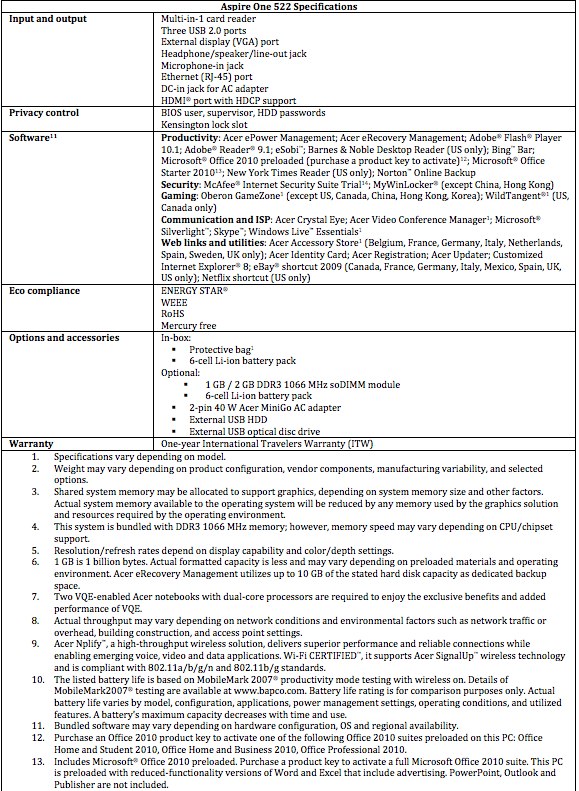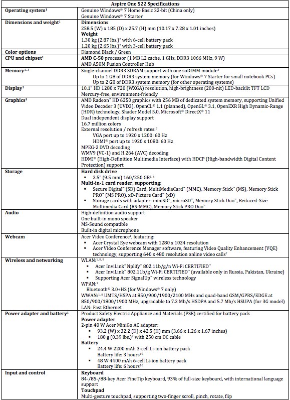 The Acer Aspire One 522 is expected Q2 in the UK, pricing TBA.