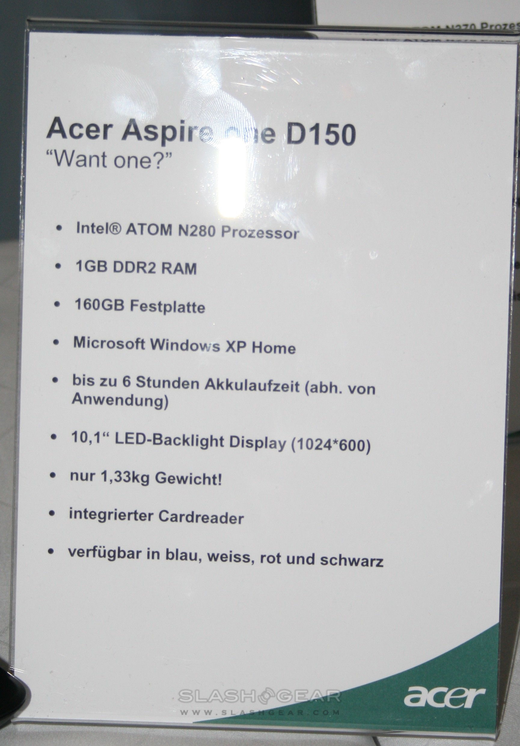 The 10-inch Acer Aspire One D150 is not exactly new, but CeBIT was the first chance the SlashGear team has had to spend some hands-on time with the netbook. The model to hand was Intel Atom N280-based, but we were most keen on trying out the keyboard and seeing whether earlier rumors of lowered build quality were true.