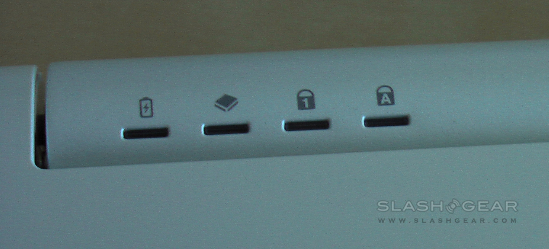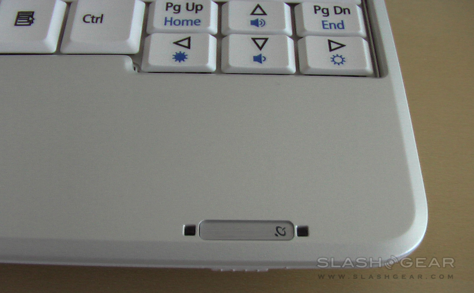 On the front edge is a switch for toggling the WiFi on and off and underneath are vents and the speakers, together with a hatch to access what would be a Mini-PCIe slot if Acer had soldered the connector in. Running along the hinge section are four LEDs, indicating battery status and drive activity, as well as caps-lock and num-lock. The keyboard has 84 keys in total, with a full function row and several Fn combinations to adjust brightness, volume, internal or external display and enter sleep mode. There's also the useful ability to switch off the touchpad for times when you're using an external mouse.