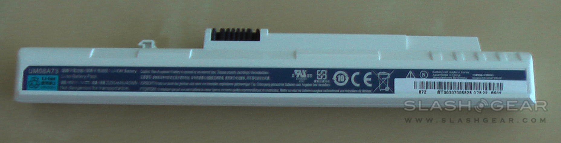 It's worth noting that Acer's estimates depend on your storage format: up to 3hrs on SSD machines, but 2.5hrs on those with hard-drives. Based on our experience we'd expect Aspire One units with traditional hard-drives to last around two hours. Acer also offer a six-cell pack, rated for up to 5.5hrs with a hard-drive netbook; it'll add bulk, but the price is relatively low (around $50 more) and any extra longevity would be welcome.