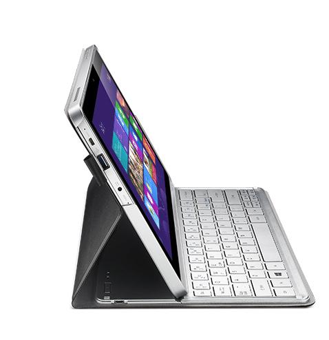 In that orientation, the P3 can be used either with the fingers or with a stylus; Acer will offer that separately, though the case will have a slot to store it in-between use. Connectivity includes a USB 3.0 port, HDMI, and a headphone socket, and there are Dolby Home Theater speakers and a 720p HD webcam on the front.