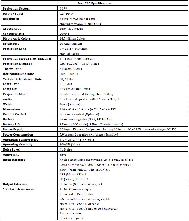 Acer C20 Pico-Projector Packs WVGA Resolution And HDMI Input