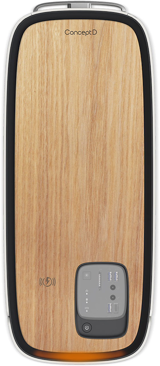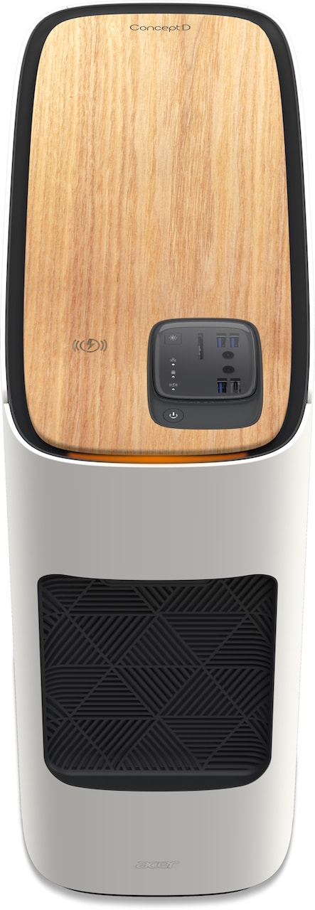 Connectivity includes 802.11ac WiFi, Bluetooth 5.0, and gigabit ethernet. Inside, there are two PCIe x16 slots, one PCIe, and one M.2 2230. The aesthetic is very different to the ConceptD900, too, with a white and wood casing that has a Qi wireless charging pad on the top. A pop-out headset cradle offers a place to hook your headphones.
