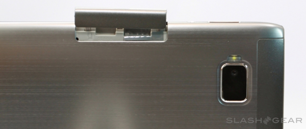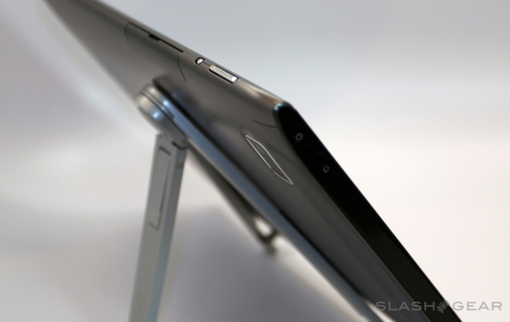 This tablet joins the still small ranks of approximately 10-inch tablets, this one measuring in at 10.1-inches in the face surrounded by a 10.24 x 6.97 x 0.52-inch (260 x 177 x 13.3-mm,) 25.75-oz (730-g) heavy (display included) body. From there you'll want to notice that the entire back section is made of a thin, light aluminum while either side of the device is made of plastic. There's a removable cover at the top (or the side, however you'd like to look at it,) that reveals your SDcard slot and future functional slot for LTE SIM card. You can jam up to 64GB of memory on an SDcard in that first slot, while the SIM card slot remains inactive for now.