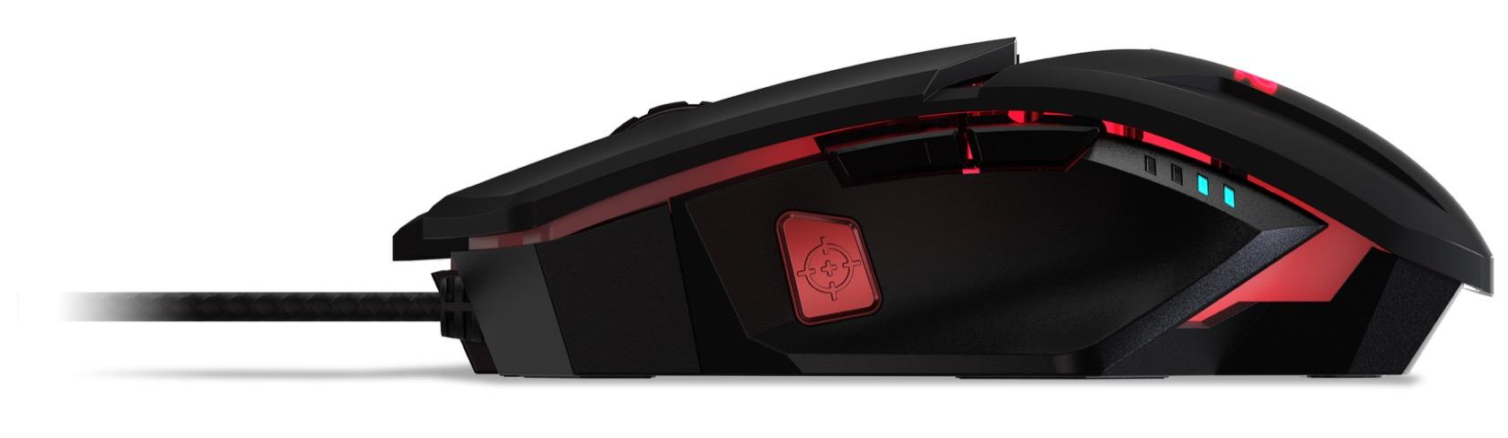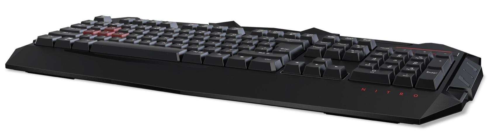 Then there are the Nitro accessories. There's a Nitro Keyboard, with ABS membrane-style keys supporting multicolor backlighting split into three zones. That will be priced at $29.99 and launch in Q4. The Nitro Mouse has seven buttons including burst fire, six-level adjustable DPI, lighting, and is rated for up to 4,000 DPI. Acer will include optional weights (5g x 4) and a 5m click lifespan guarantee, and it'll also be priced at $29.99.
