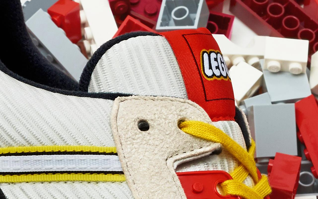 These sneakers are largely off-white or bright white with two different sorts of white texture – stone-like and ribbed. The three stripes are white, black, and yellow, with a square pattern down the middle. The lace holes are run through the off-white portion of the shoe as well as a LEGO red portion made with rubbery plastic.