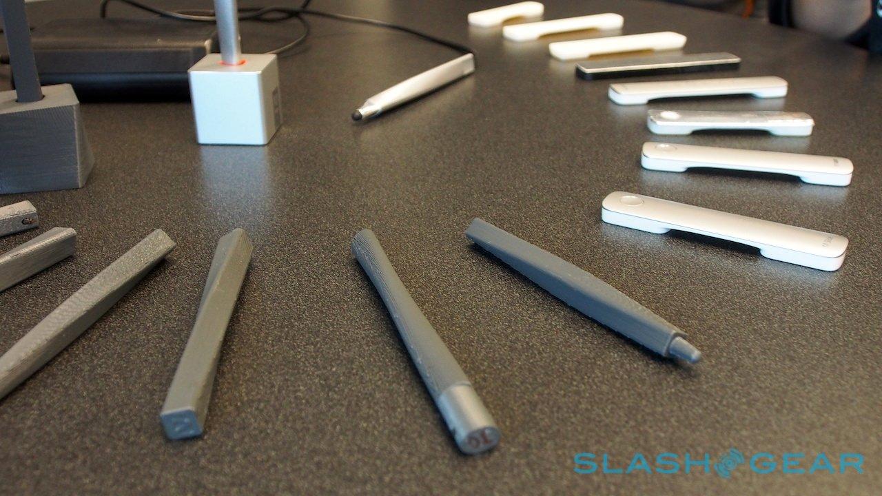 Adobe's pen is a single length of aluminum with a triangular cross section and a slight twist – fashioned, in fact, using hydroforming, where high-pressure water forces a metal tube to distort to a mold – with a nib on one end and a multi-color LED on the other. The triangle LED is surrounded by three charging pads, which magnetically clasp to the charging case.