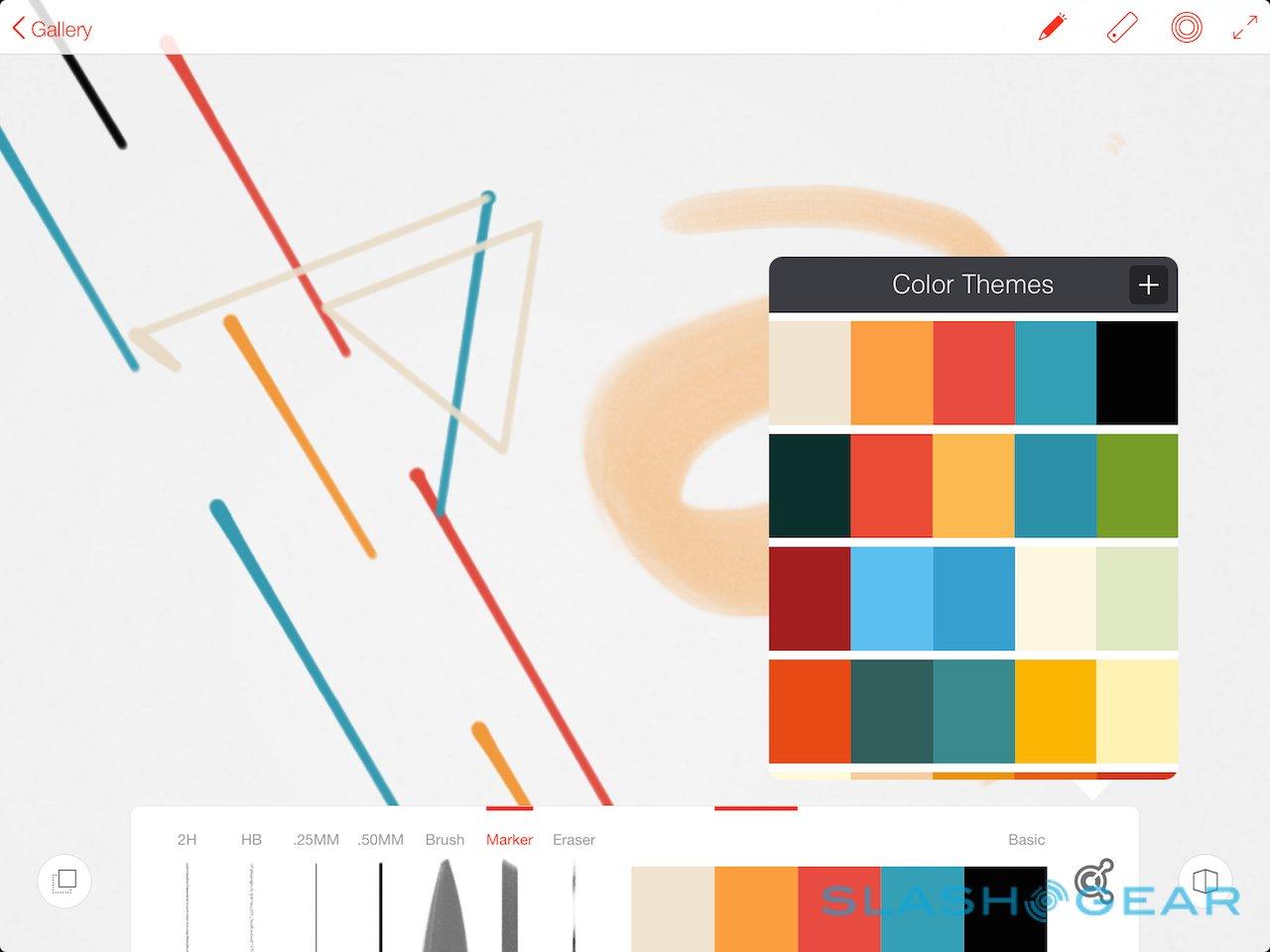 At its simplest, Line allows you to choose between 2H and HB pencils, .25mm and .5mm pens, a marker, and a brush, with a choice of either a full color wheel or preconfigured colors sets. The digital ink blends and merges as the marks you leave cross, while pressing harder with Ink makes for thicker lines.