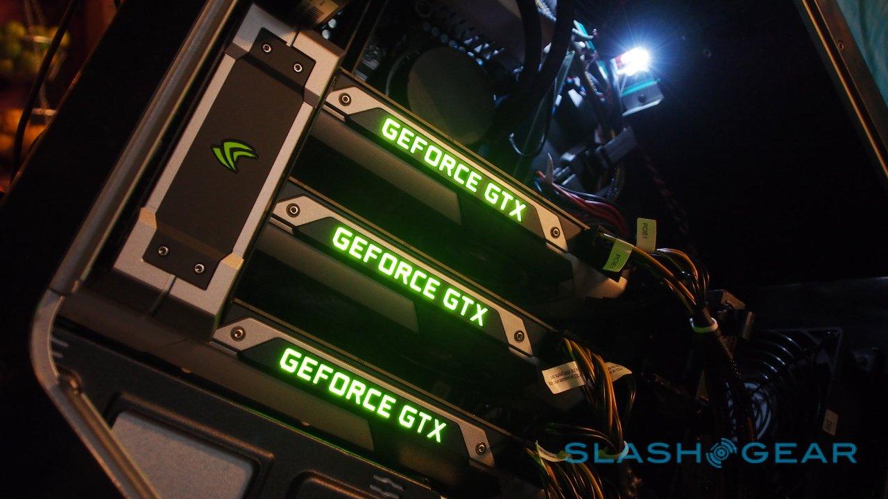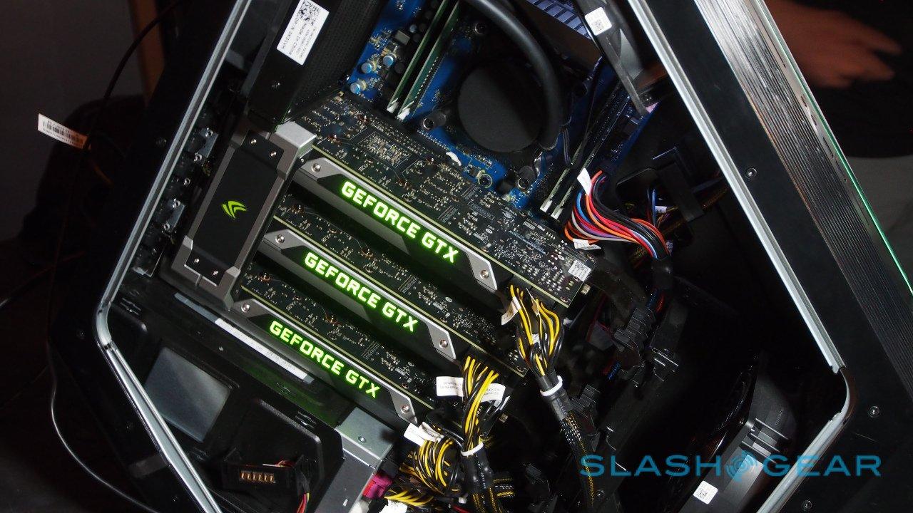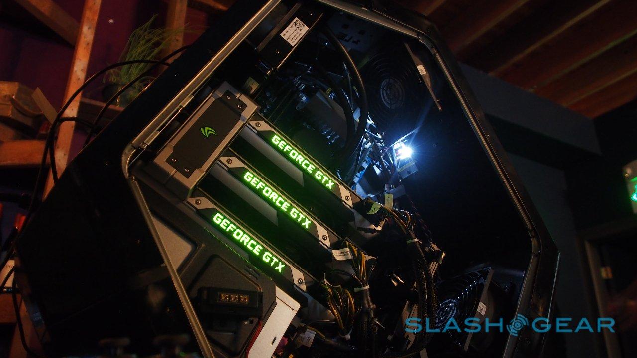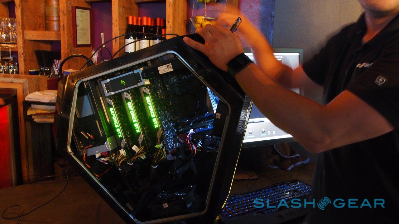 Up to three 300W double-wide, full-length video cards can be installed – the unit we tried had three hefty NVIDIA GeForce inside, but AMD Radeon cards will be on the options list too – and up to a 1.5KW power supply can be specified. There's liquid cooling for the 8/6-core Intel Extreme processors, which come unlocked, and up to 32GB of DDR4 memory support on the Intel X99 motherboard.