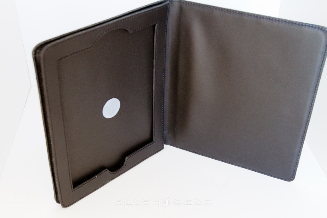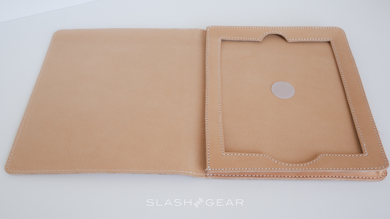 The physical design of the cases is pretty straightforward. The iPad slides into the stitched leather frame where it hinges, and is held in place with a central rubber dot . It's not quite the tight grip of, say, Apple's official iPad case, but nor is it a slip-sleeve. You'd have to shake it at just the right angle to accidentally drop the tablet, certainly. It's worth noting that there's no clasp, strap, Velcro or magnet to keep it closed; Aligata reckons magnets have an adverse affect on Apple's mobile devices. Whether or not that's true, we do wish there was some simple way of keeping the folio closed when you drop it into your bag.