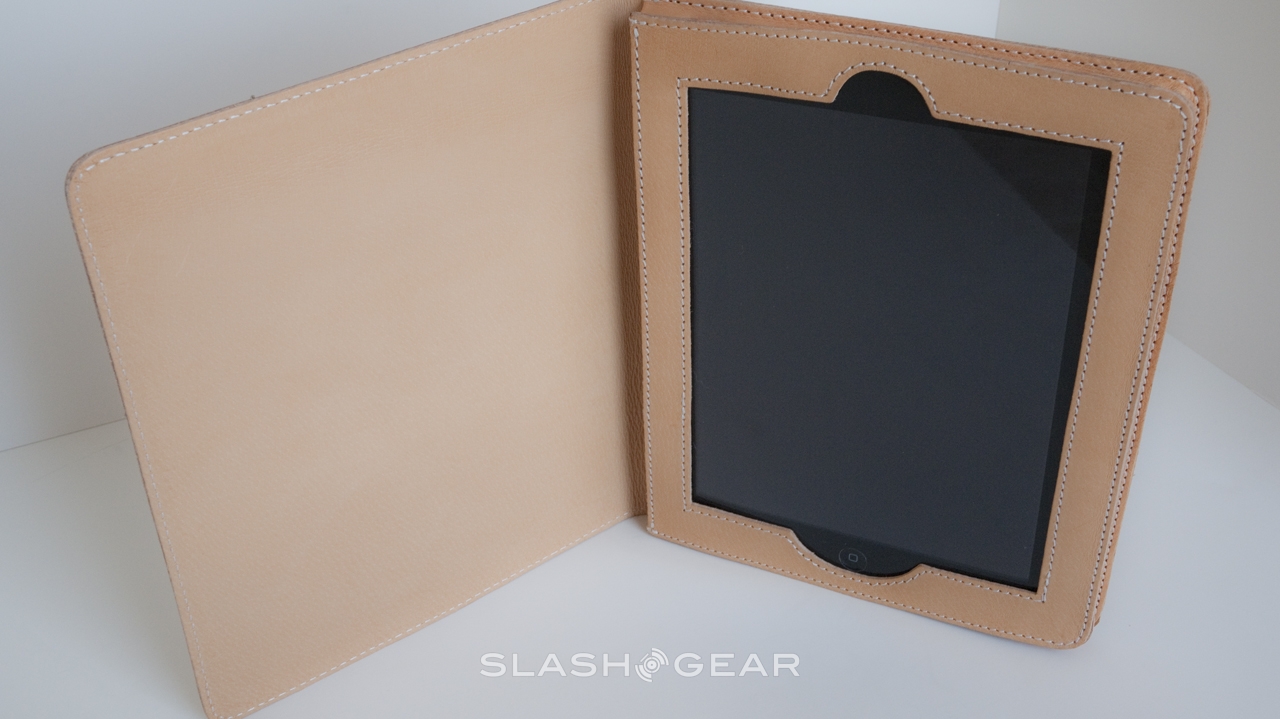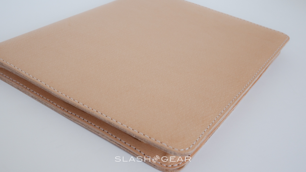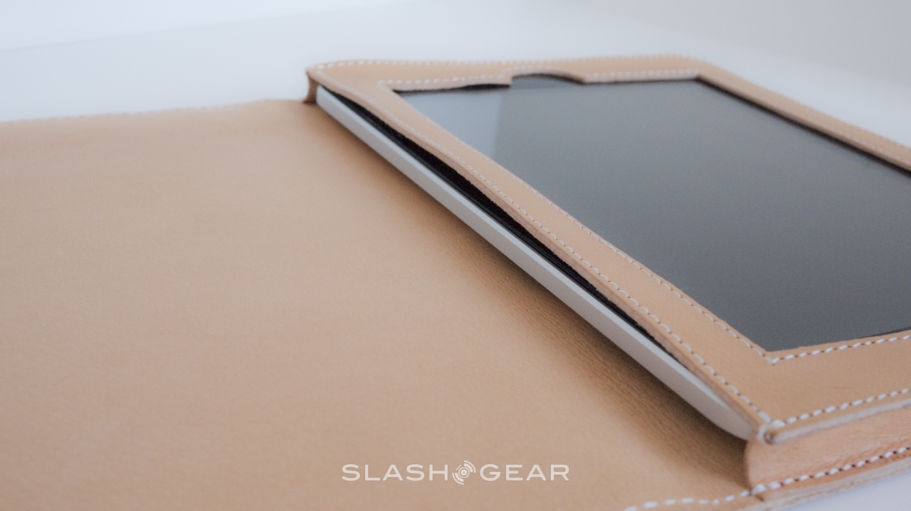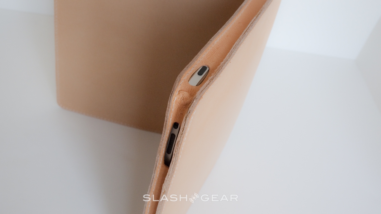 Cut-outs at the top allow access to the sleep/power button and the headphone socket, on the side for the volume rocker and screen orientation switch, and at the bottom for the dock connector and speaker. Either a hole is punched in the bezel at the top, or a notch, for the ambient light sensor, while the lower edge scallops to accommodate the home button. Aligato use 3/16-inch thick leather, which is on the thick side for cases we've seen but also surprisingly supple. It certainly feels capable of withstanding a knock or drop, even if it landed on one of the corners.