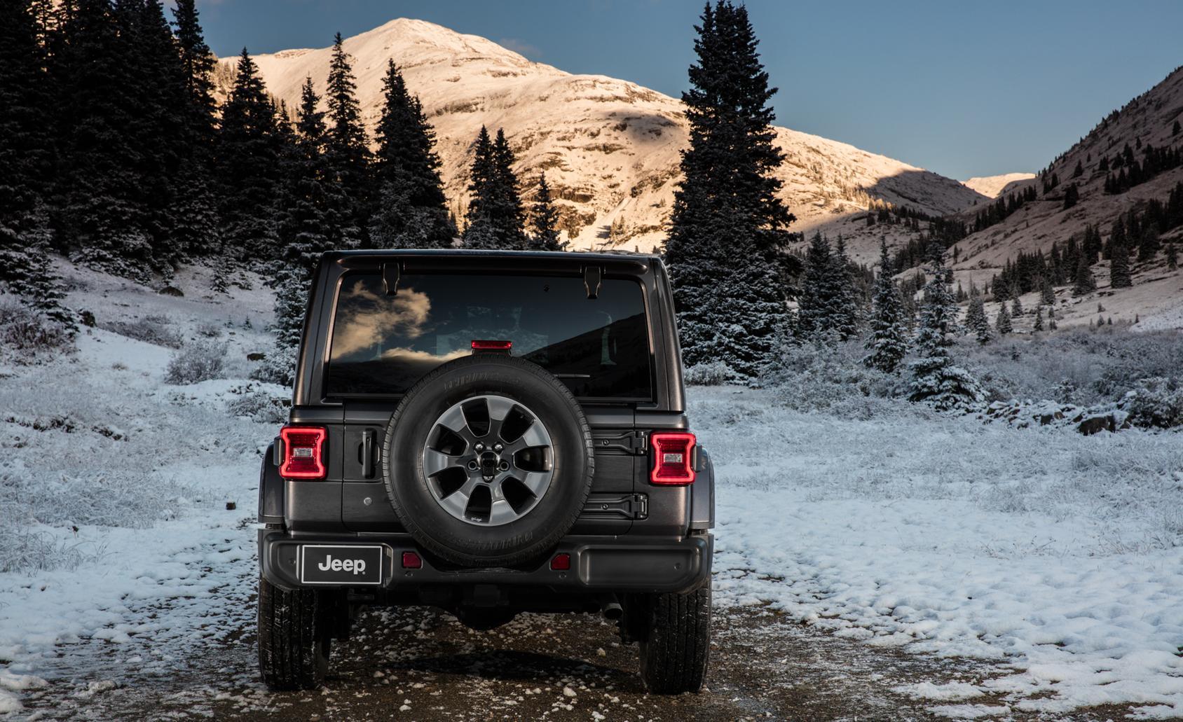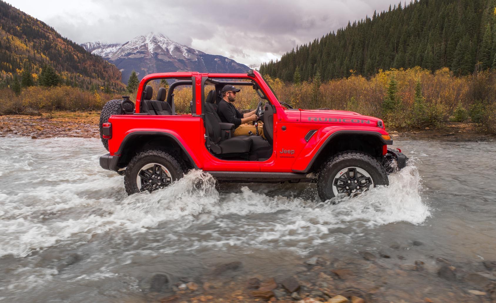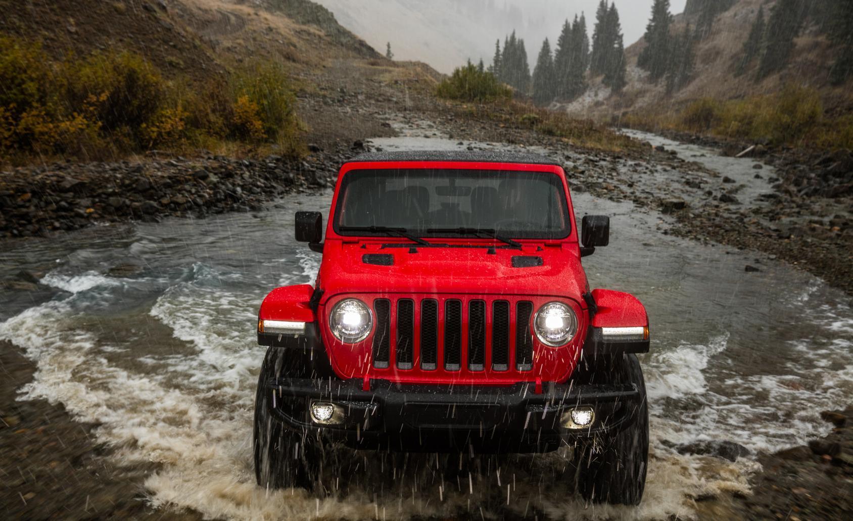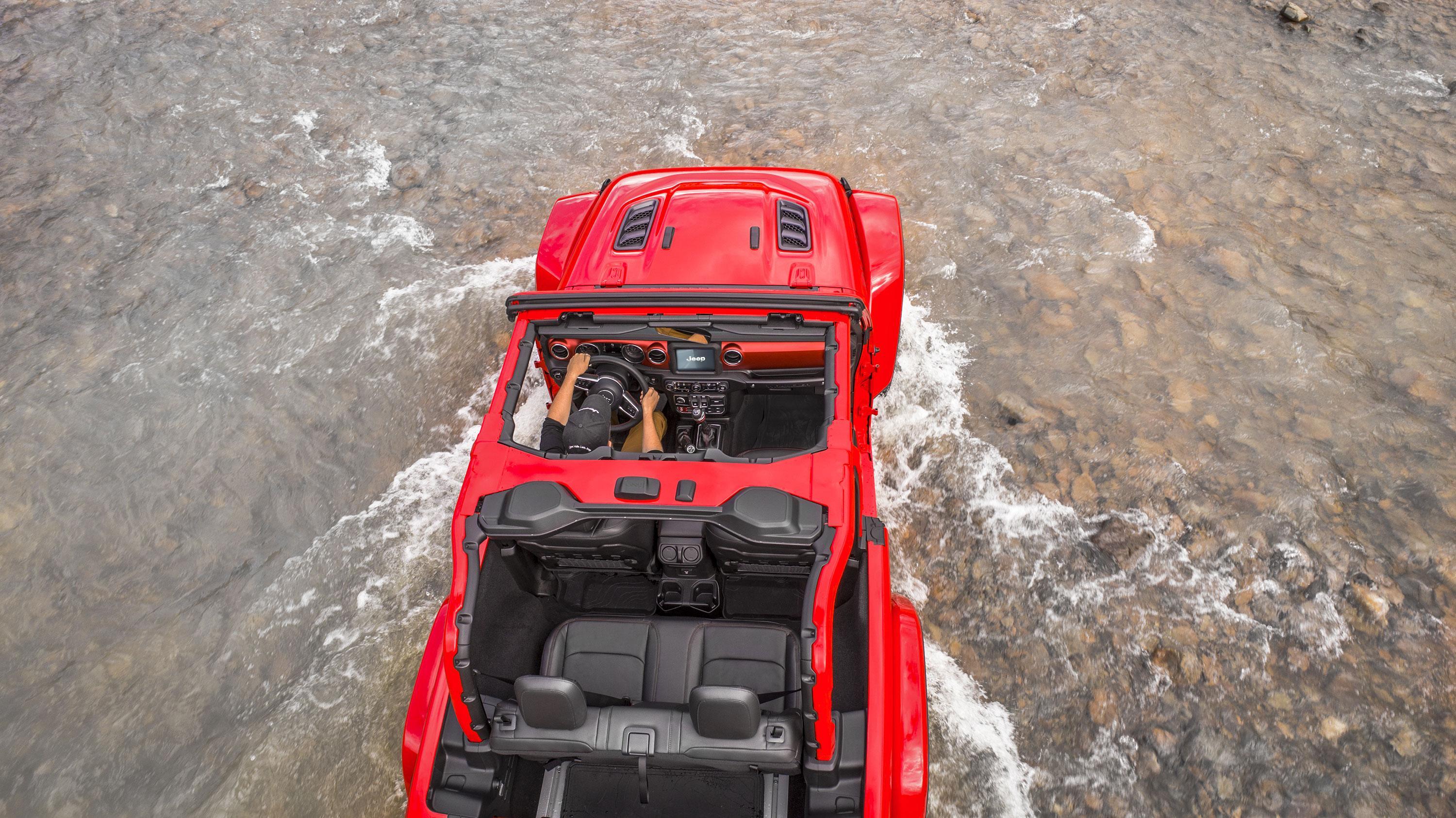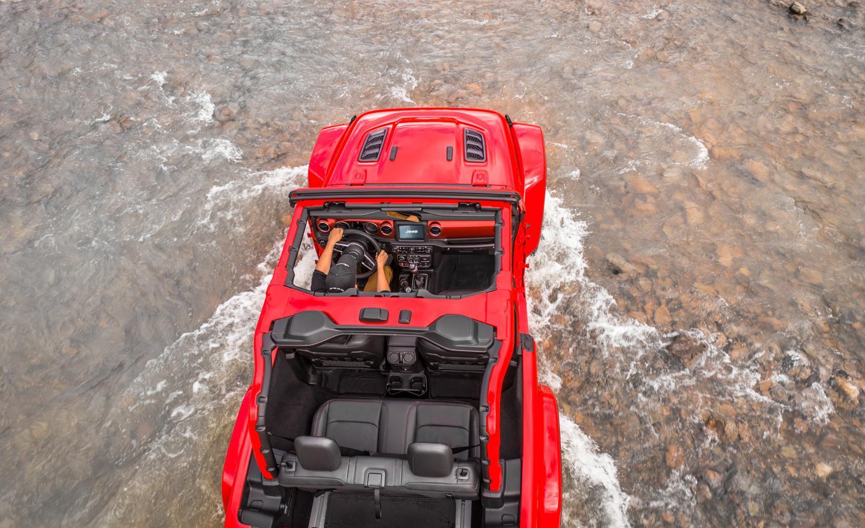 Wrangler drivers will be able to ford up to 30-inches or water. While the design is all new, the vehicle still looks like a Jeep. It packs round headlights and square taillights; the aerodynamics are improved without sacrificing the iconic square shape of the car. The Wrangler JL can be had on highly-equipped versions with a power folding soft top, which is a first for the line.