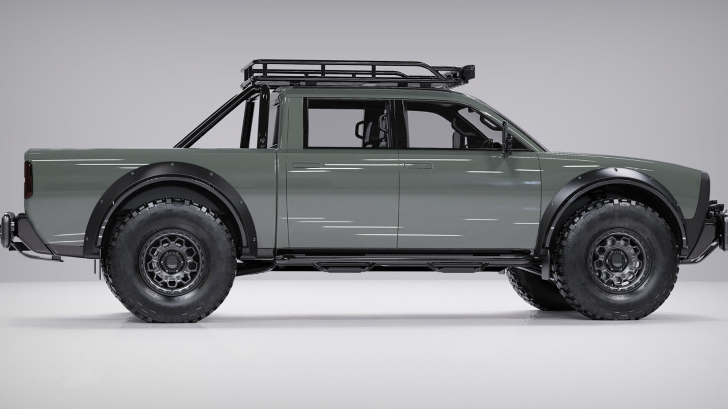 Under the doors are also compact step rails that look like they are intended to protect the vehicle's body while off-roading. The truck also features wide fender flares and looks fantastic in general. Other interesting features of the truck include a bed cover that appears to be made out of aluminum and a rack that spans the bed allowing for items to be attached on top of the bed itself.