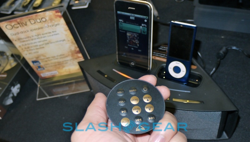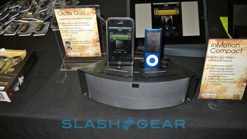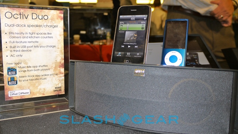 Altec Lansing were out last night to preview their latest iPod speaker dock, the Octiv Duo, and it's designed for those households with more than one iPod or iPhone to rejuice. The horn-shaped dock can not only recharge both devices simultaneously, but also shuffle tunes stored on each (using the free Music Mix app) to put an end to "no, my playlist next" arguments.