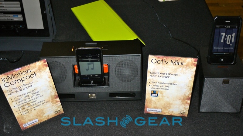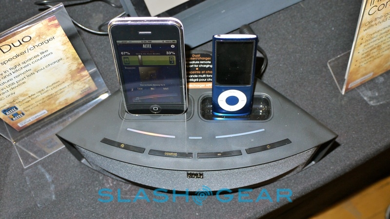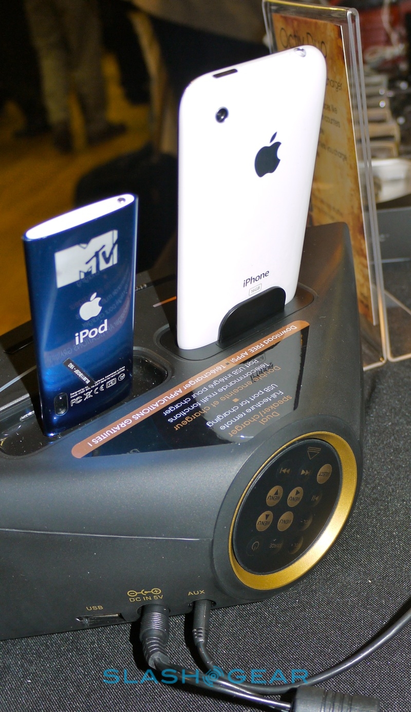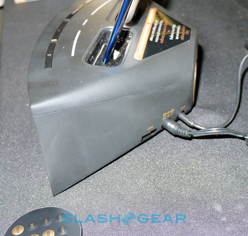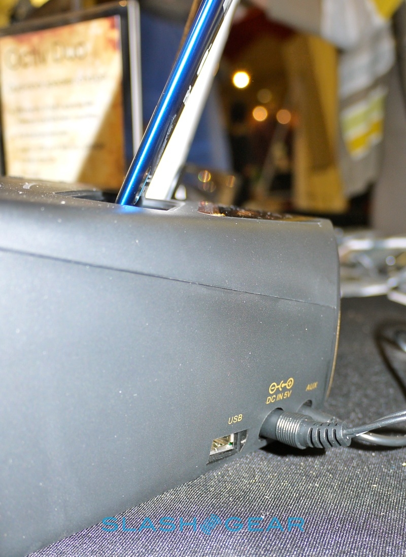 One thing we'd like to have seen is a pass-through sync port, allowing you to hook up the speaker dock to iTunes and put new media on as they recharge. You do get a 3.5mm aux-input for non-Apple PMPs, however. It'll be available soon, priced at $99.95.