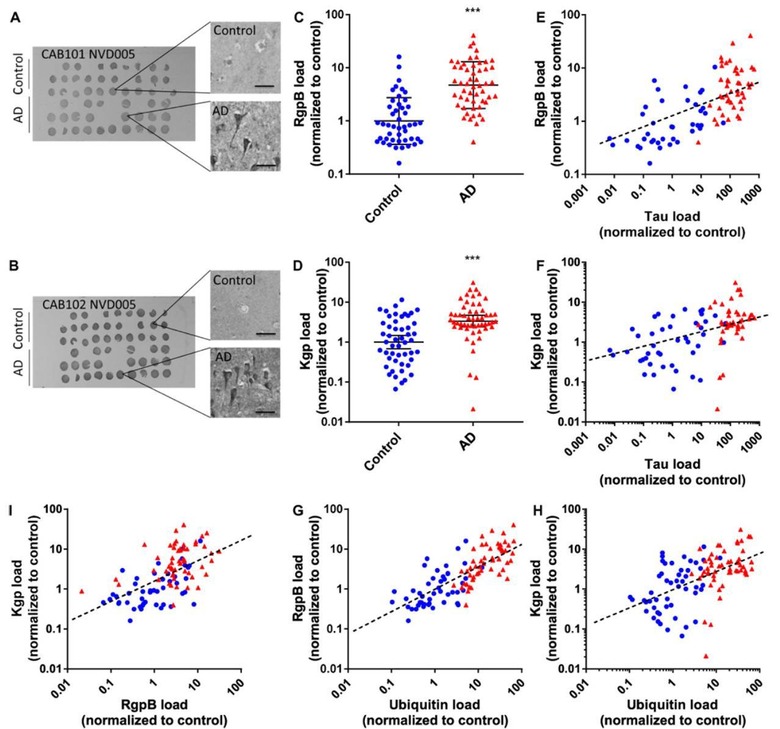 Tests are marked by "gingipain load" here. Those subjects that exhibited a significant enough load showed the presence of RgpB or Kgp –and therefore the presence of PG. In all, 96% of 53 AD samples (51 of 53 samples) tested positive for RgpB, and 91% of 54 AD samples (49 of 54 samples) tested positive for Kgp.