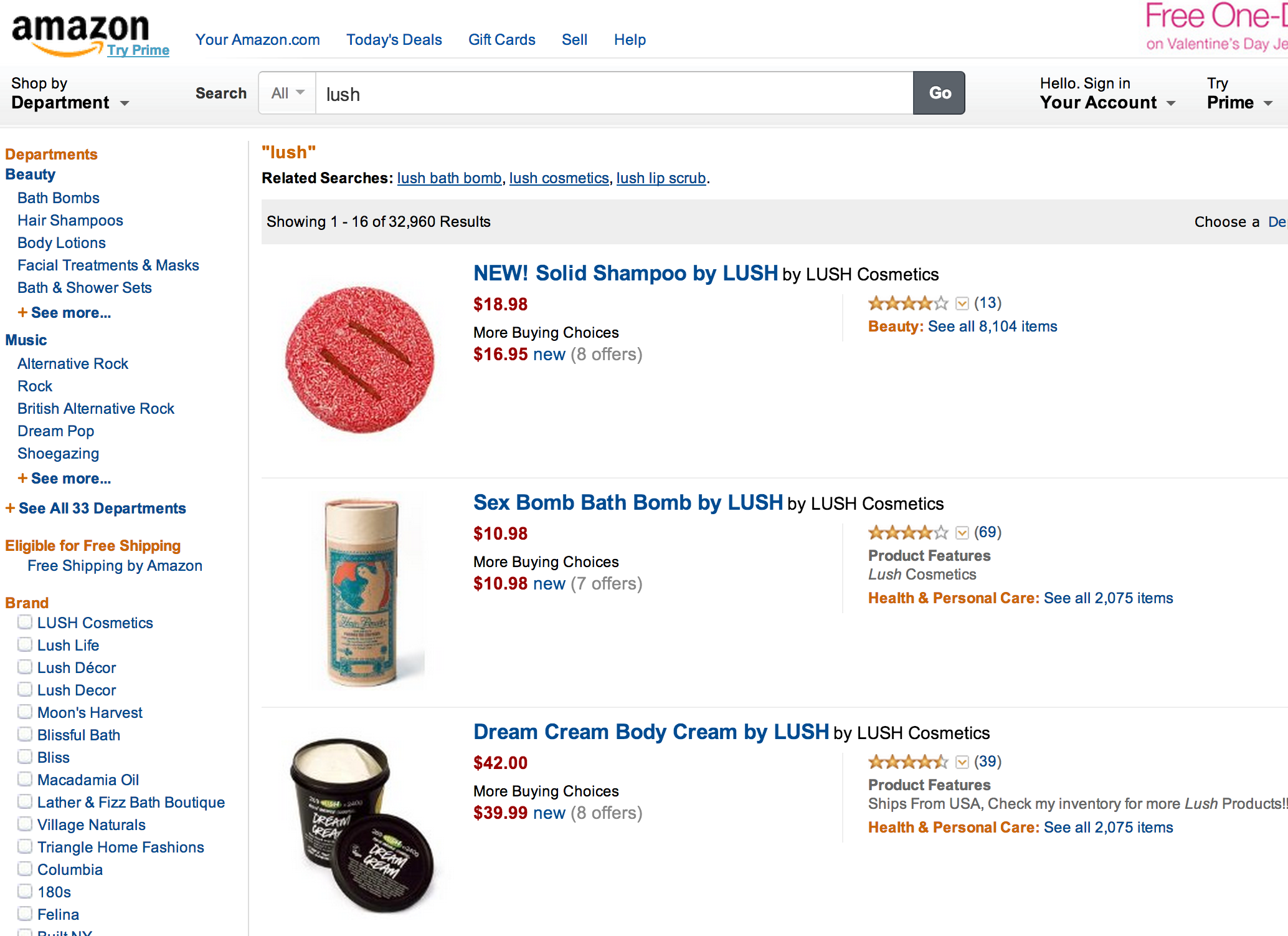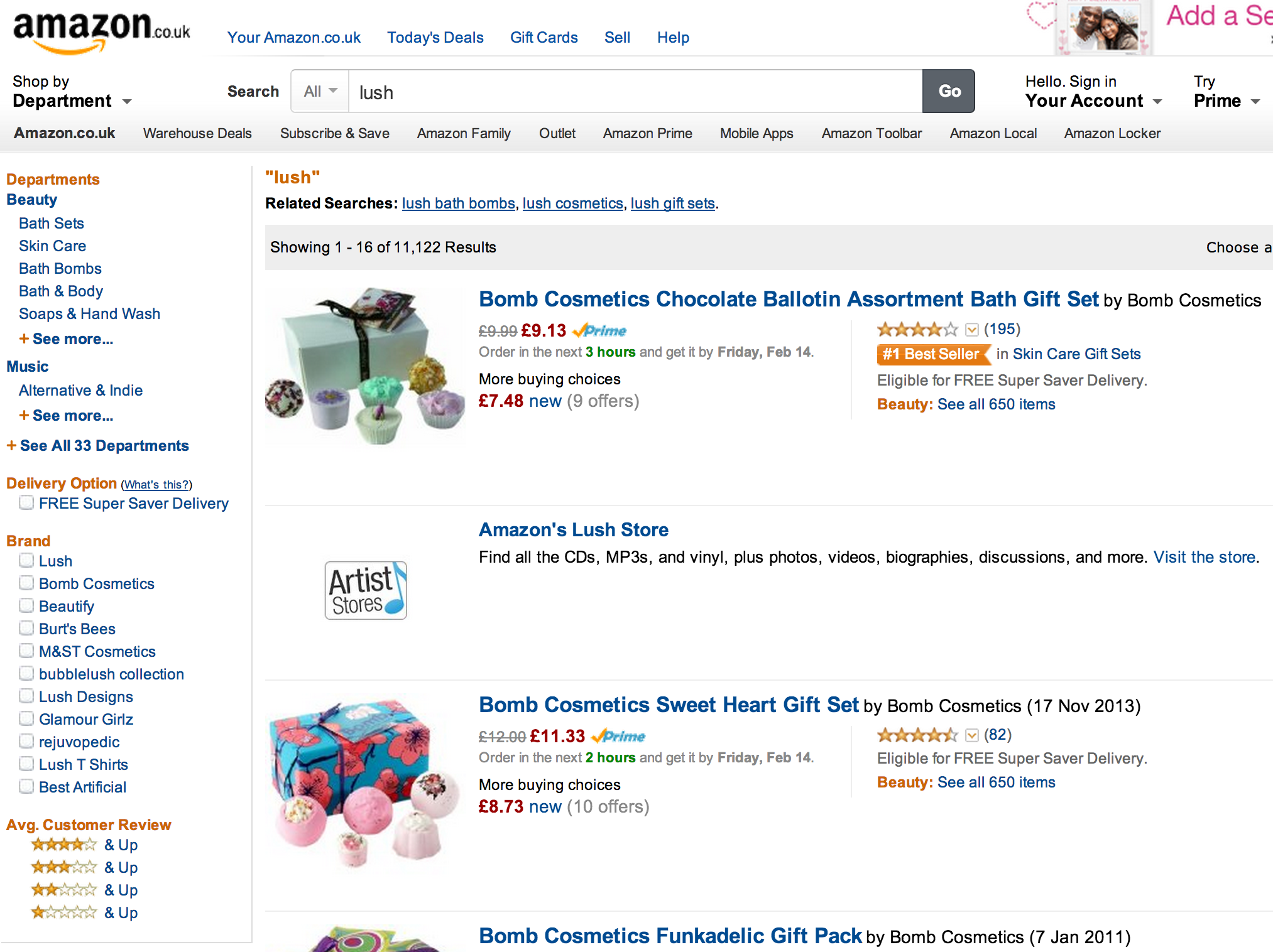 The name "Lush" brings up rather different results in Amazon.co.uk and Amazon.com, but this battle is about a few unique products the Lush crew aren't especially happy about, listed by Amazon with similar looks. These looks are deceptively similar, so suggested Lush, so much so that their "sex bomb" bath salts and "Prince Charming" shower gel are marked specifically.