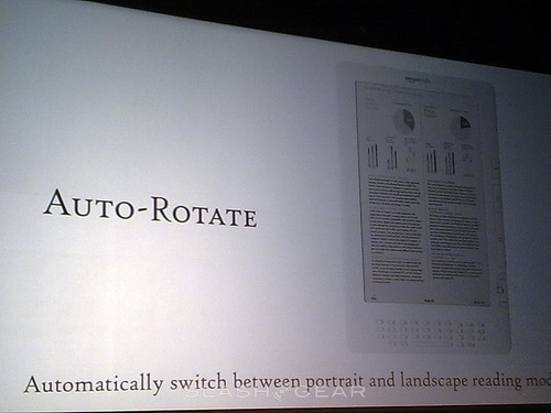 Kindle DX's display content auto-rotates so users can read in portrait or landscape mode, or flip the device to read with either hand. Simply turn Kindle DX and immediately see full-width landscape views of maps, graphs, tables, images, and Web pages.