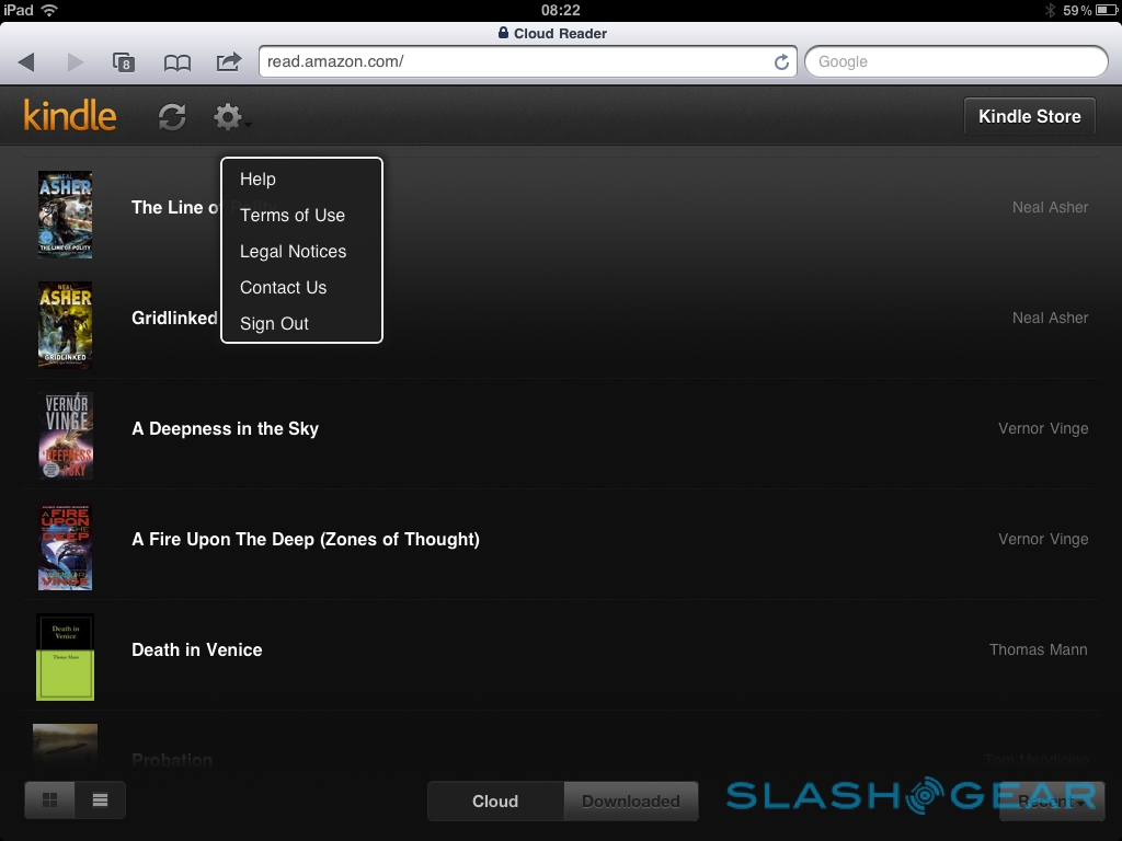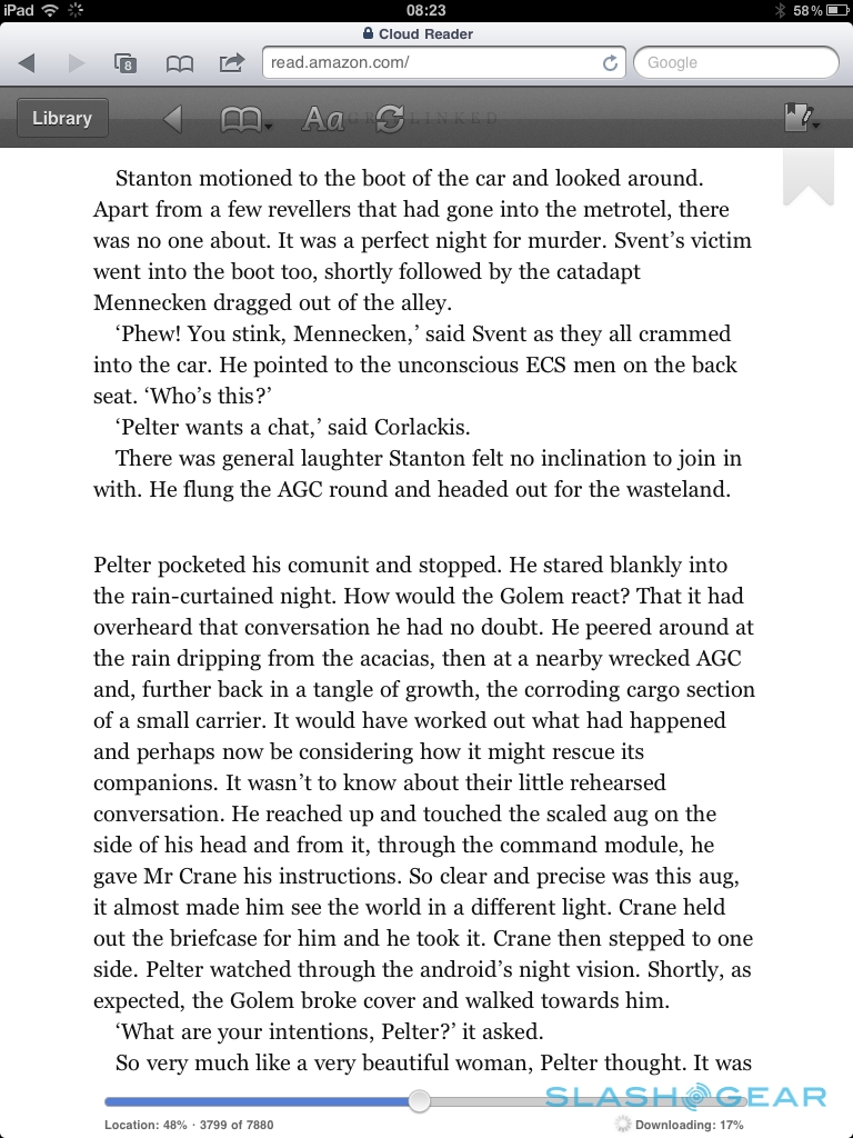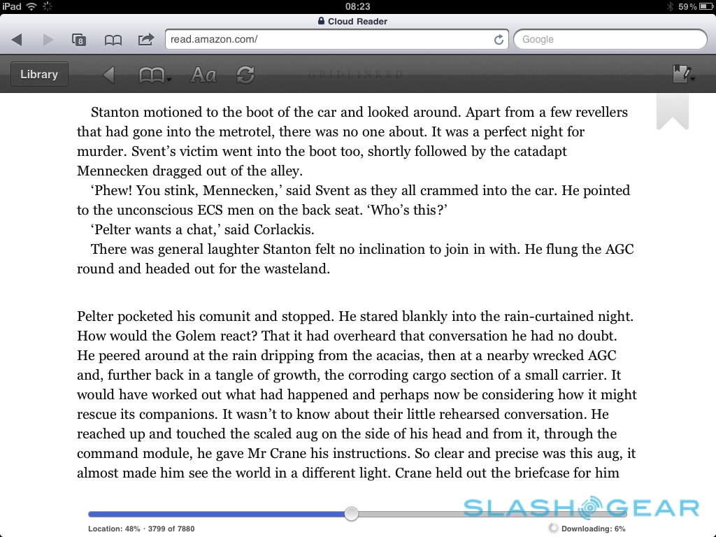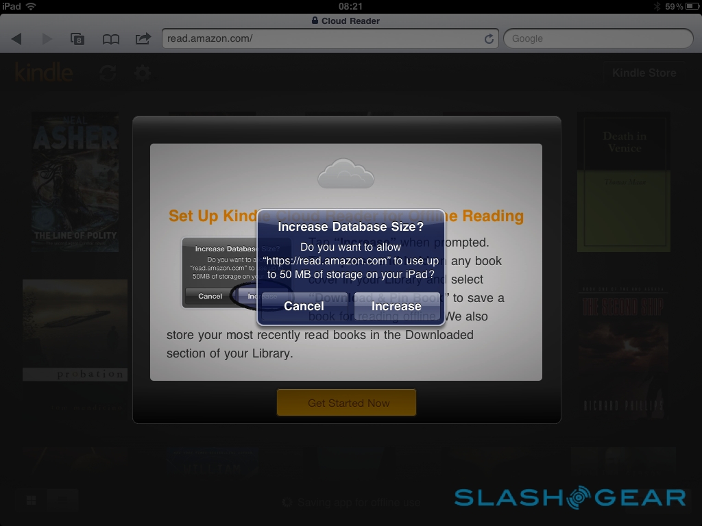 Just as with the native Kindle app, Amazon's new web-based version allows you to browse through copies of ebooks you've purchased previously and selectively download them to your iPad. On initial setup – simply a case of plugging in your email and password – the app prompts you to allow it 50MB of storage space for this caching. From then on, it works pretty much as a native app, though there are still some bugs to be ironed out; during brief testing this morning, the Kindle web-app crashed Safari (taking all of our other tabs with it), something we've found less common with the standard app.