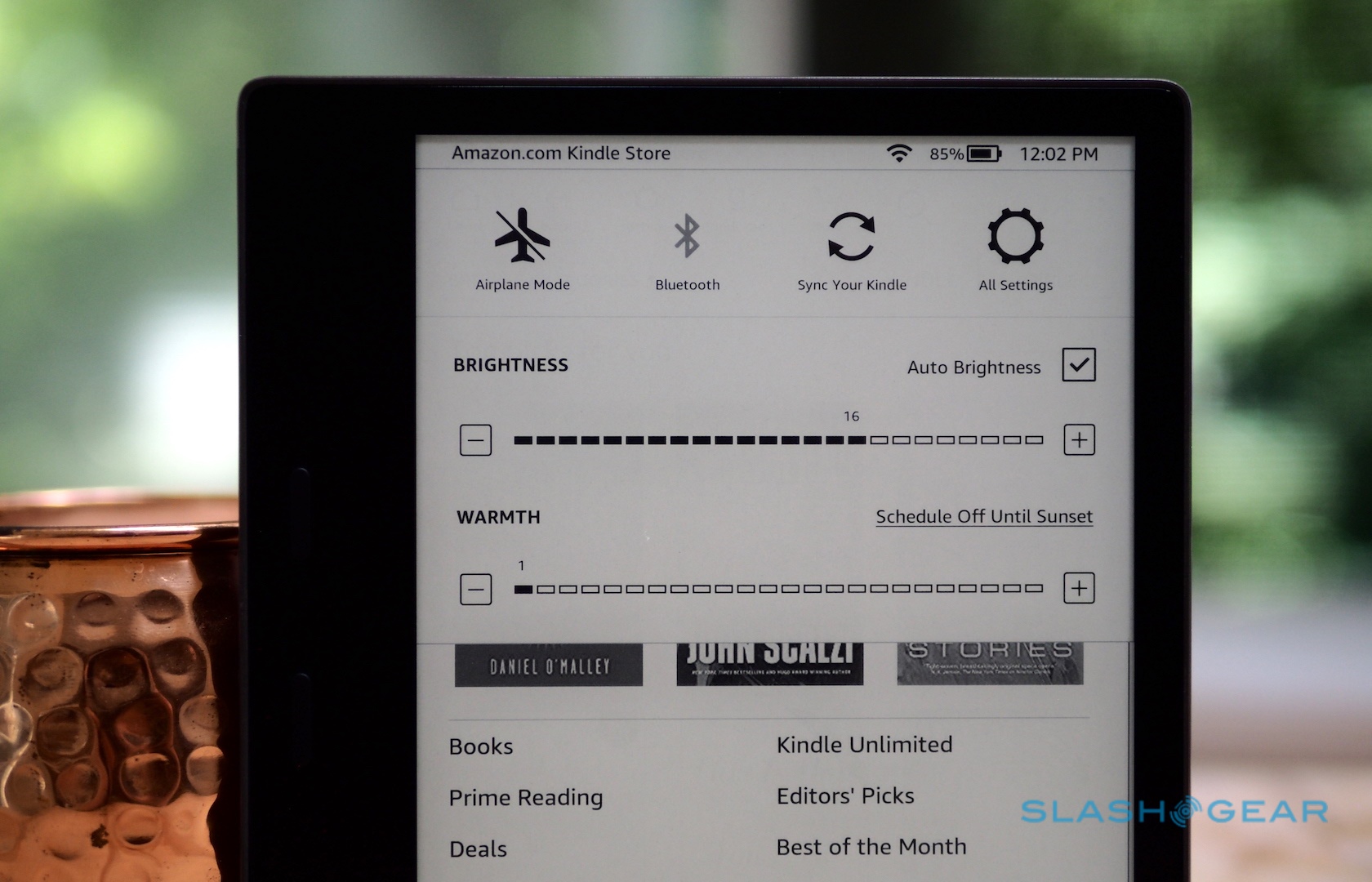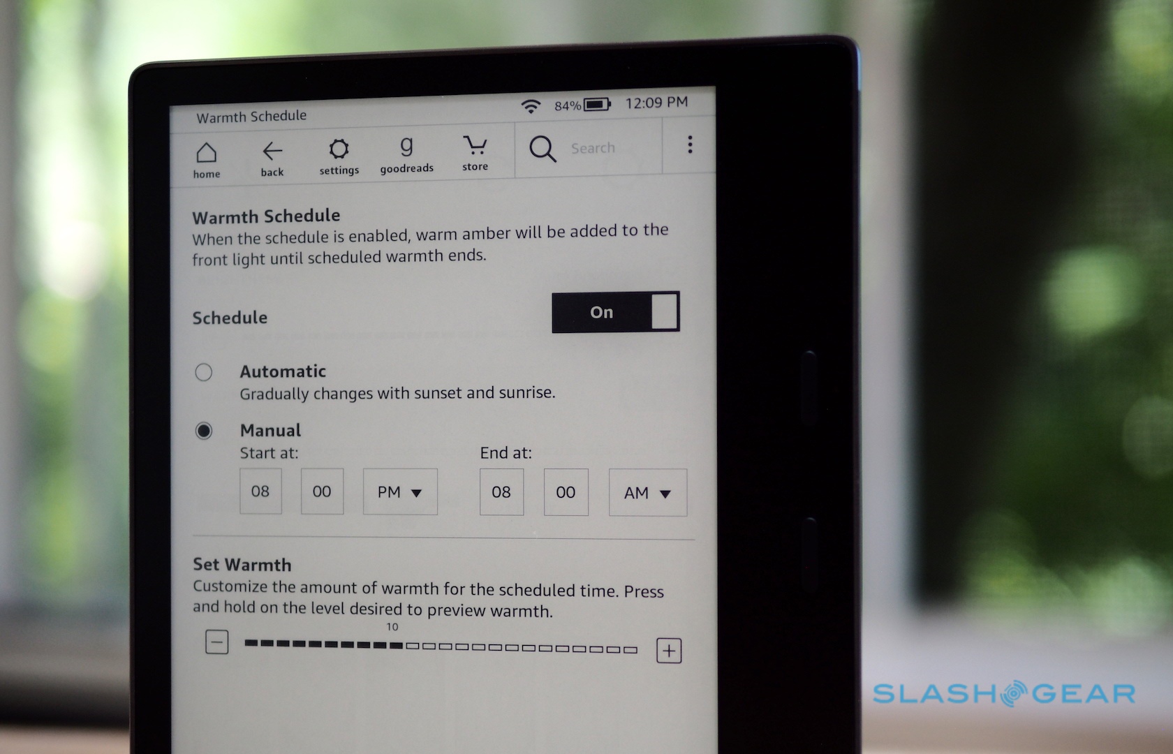 You can control the warmth manually, by adjusting the level yourself or setting a schedule for when it should shift warmer and when it should go cooler. Alternatively, there's an automatic setting. As long as you connect to WiFi, the Kindle Oasis knows when sunrise and sunset is, and finesses the screen warmth accordingly.