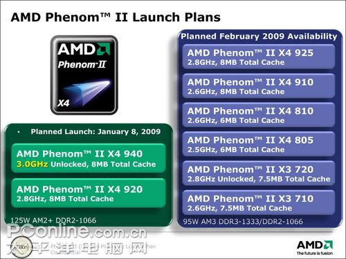 AMD could be preparing a new 3.1GHz Phenom II processor, for launch in Q2 2009, in the shape of the Phenom II X4 950. The chip, which is mentioned on a slide purportedly leaked from AMD themselves, has 8MB of total cache (which The Tech Report suggests could be split as 6MB of L3 and 512KB of L2 per core) together with a 125W thermal envelope, support for DDR3 1333MHz memory, and a 4GHz HyperTransport interface speed.
