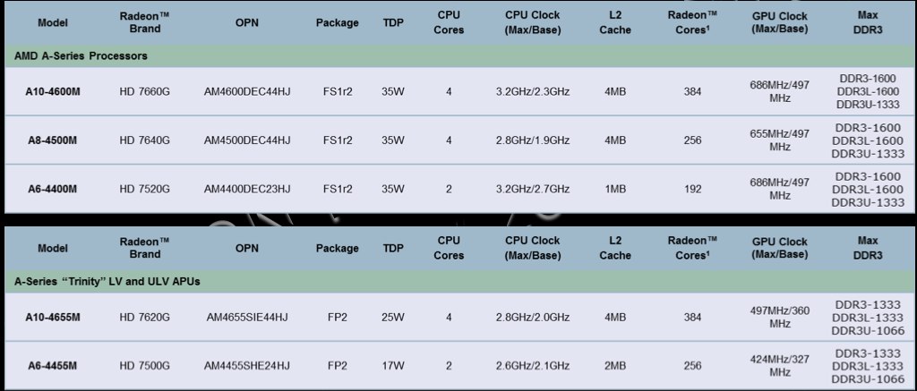 There's a new dual-channel DDR3 memory controller, a unified Northbridge and a new Northern Islands Radeon GPU along with an HD Media Accelerator. Up to four "Piledriver" cores with 2MB L2 cache are the other half of the chip, flanked with HDMI, DisplayPort 1.2 and DVI controllers, along with 24-lane PCI Express I/O. There's support for DirectX 11, USB 3.0, SATA 6 Gb/S, AMD Eyefinity and HDMI 1.4a, and AMD quotes up to 736 Gflops and up to P1361 in 3DMark11.