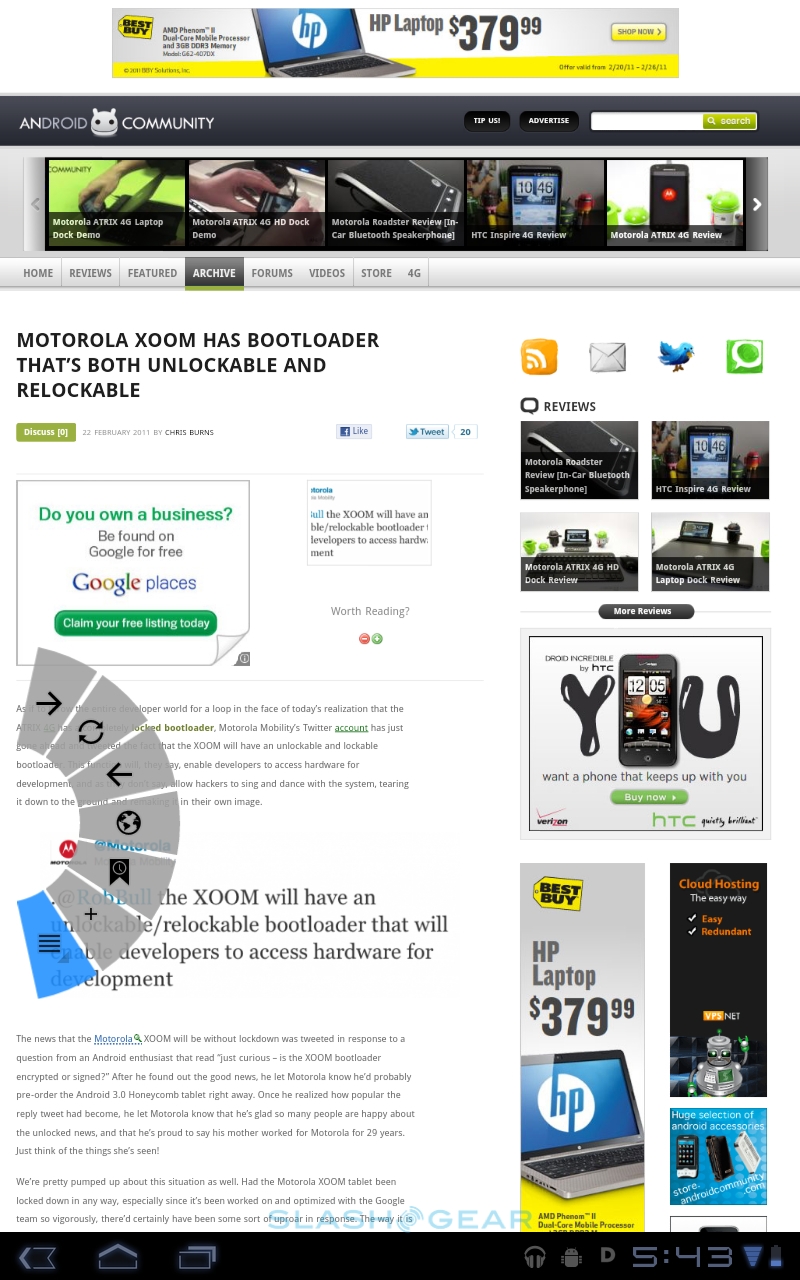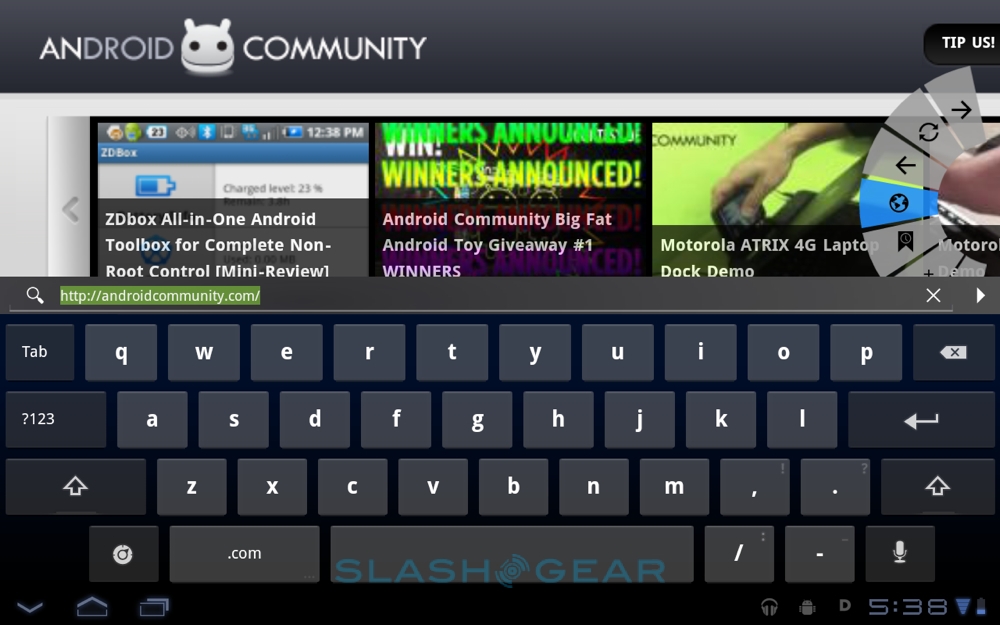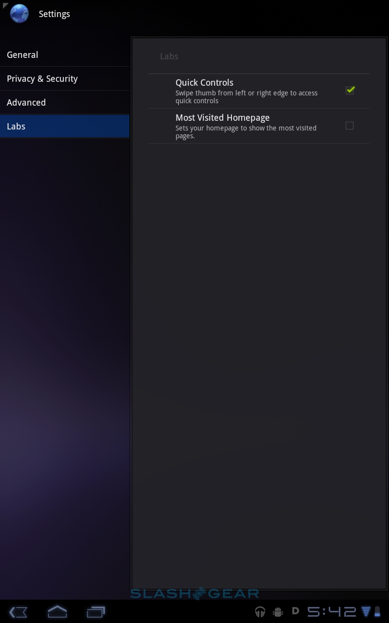 More useful are the Quick Controls, an option turned on in the browser's settings. Triggered by a finger-swipe from the left or right edges of the display, they're a crescent of shortcuts for easy access to forward/back, page refresh, Goto, menu, bookmarks and add-to-bookmarks. If your thumb is long enough, you can navigate back and forth through pages while still holding the tablet in your hand, though of course URL entry or picking from a list of bookmarks requires you to tap elsewhere on the screen. A set of directional arrows and a selection key would be a neat addition to the Quick Controls array.