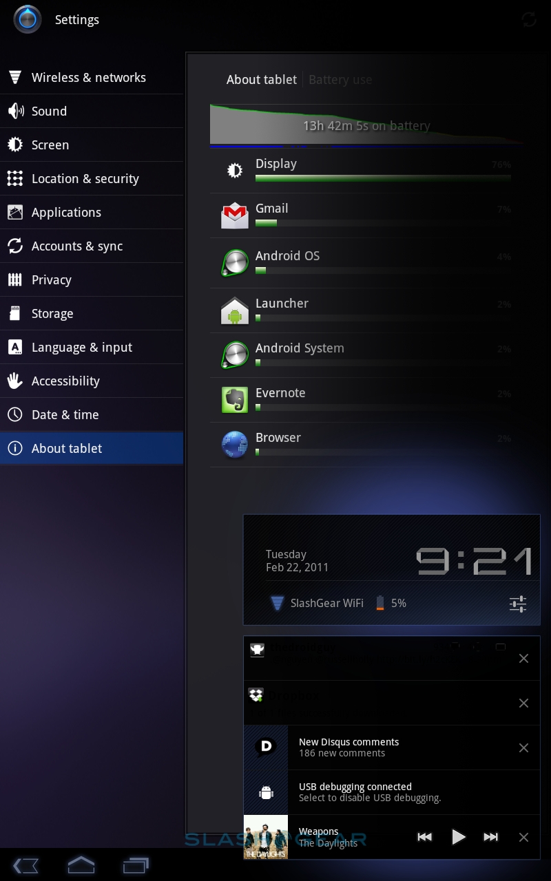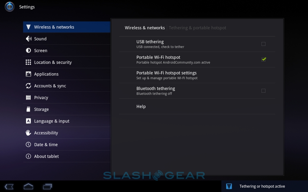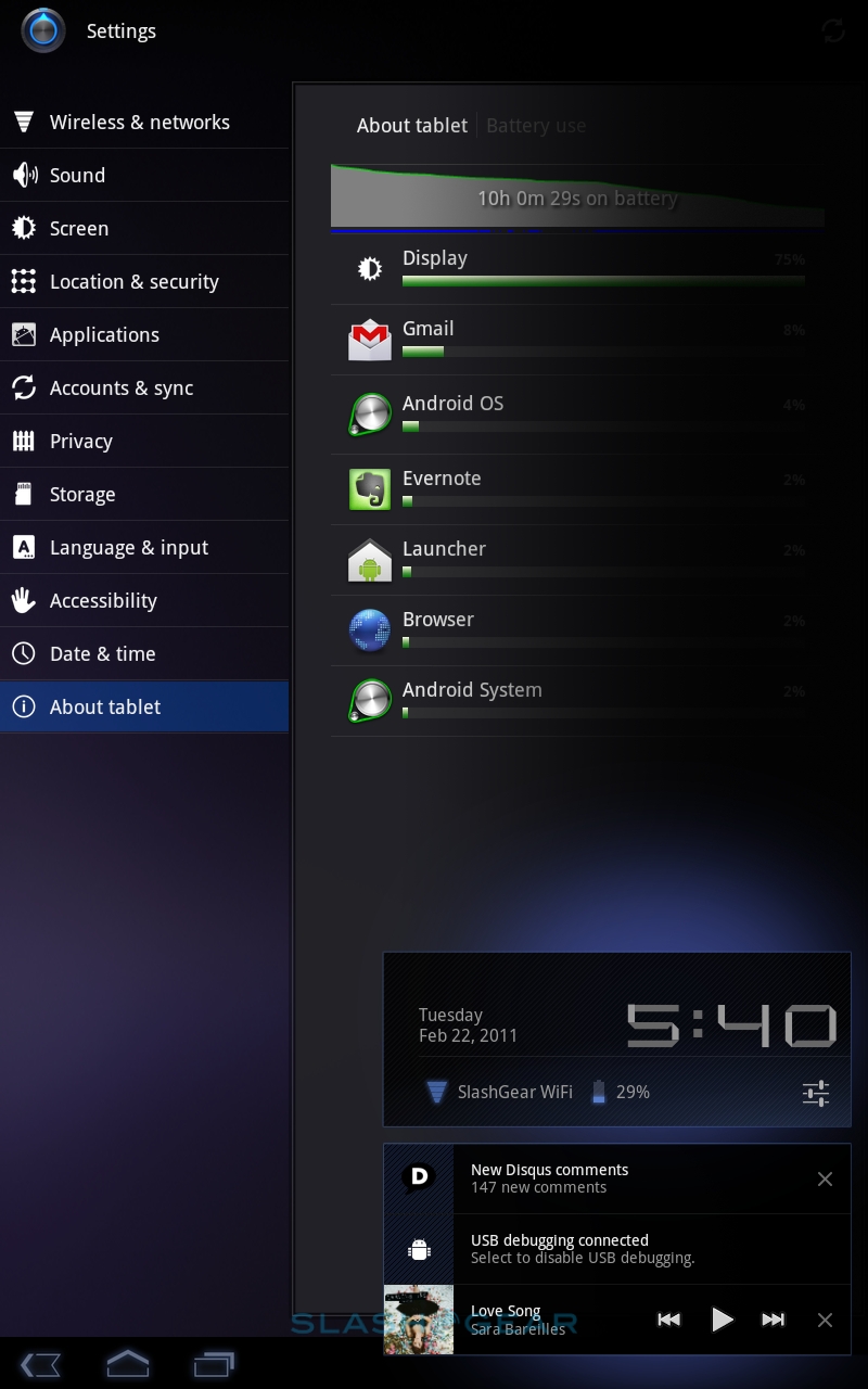 As for connectivity, Android 3.0 has mobile hotspot support for sharing 3G/4G data with up to five WiFi-tethered clients, thought you'll likely have to opt for a more expensive data package before the carriers will let you do so. There are three sharing options, USB tethering, portable Wi-Fi hotspot and Bluetooth tethering. As on Android phones, it works well, though battery life takes an inevitable hit.