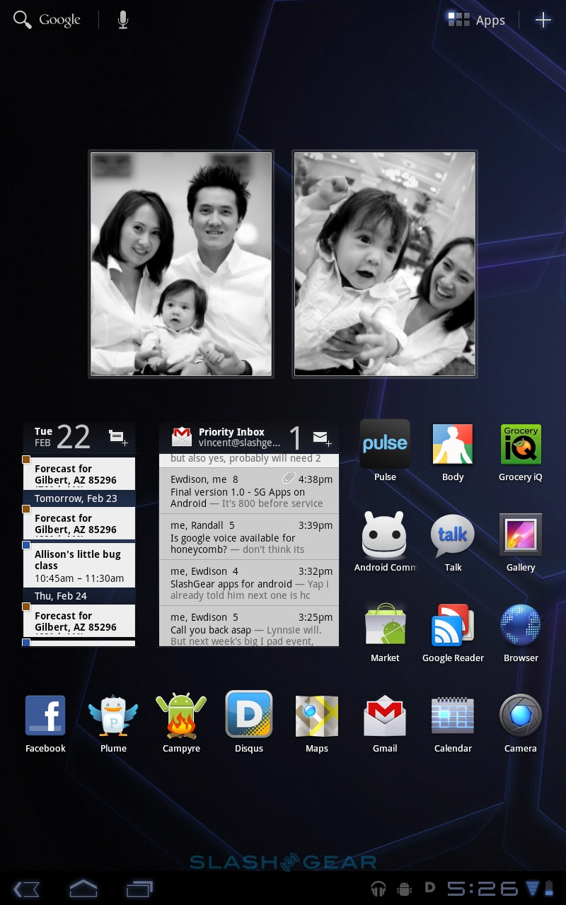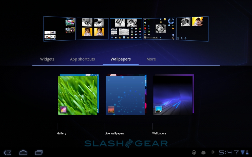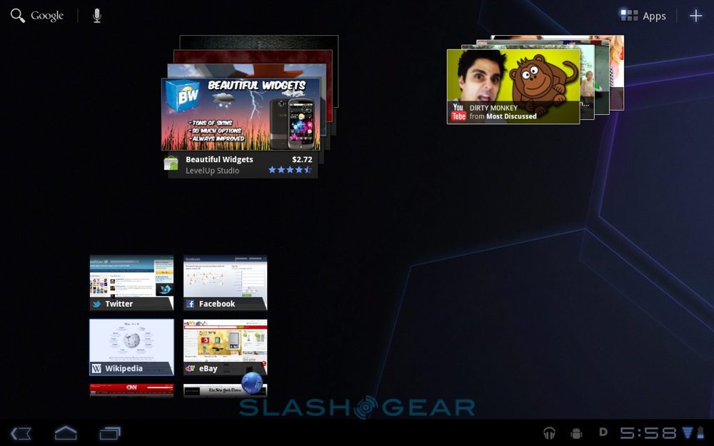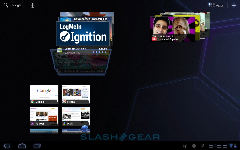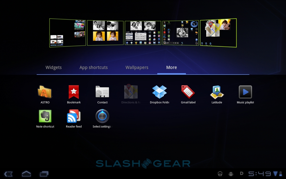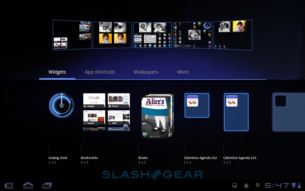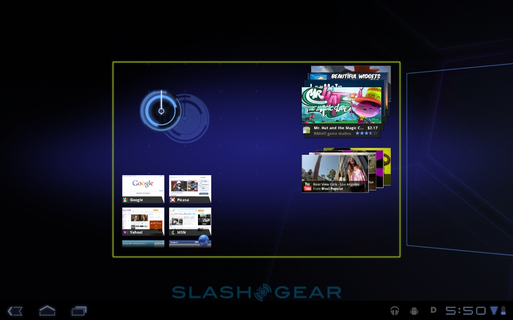Android's UI has gradually evolved into the multi-desktop icon and widget layout we're used to on smartphones today, and Honeycomb pushes that paradigm to suit larger displays. The homescreen is a horizontally scrolling array of five panes, each accommodating an 8x7 grid of icons and widgets. As on handsets, the smallest icon is a 1x1 square, but various other sizes of widget are available, and usually offering greater interactivity than previously seen. So, for instance, the Gmail widget not only shows the most recent three messages (whether in your inbox or sorted by label) but can be scrolled to show older emails as well.