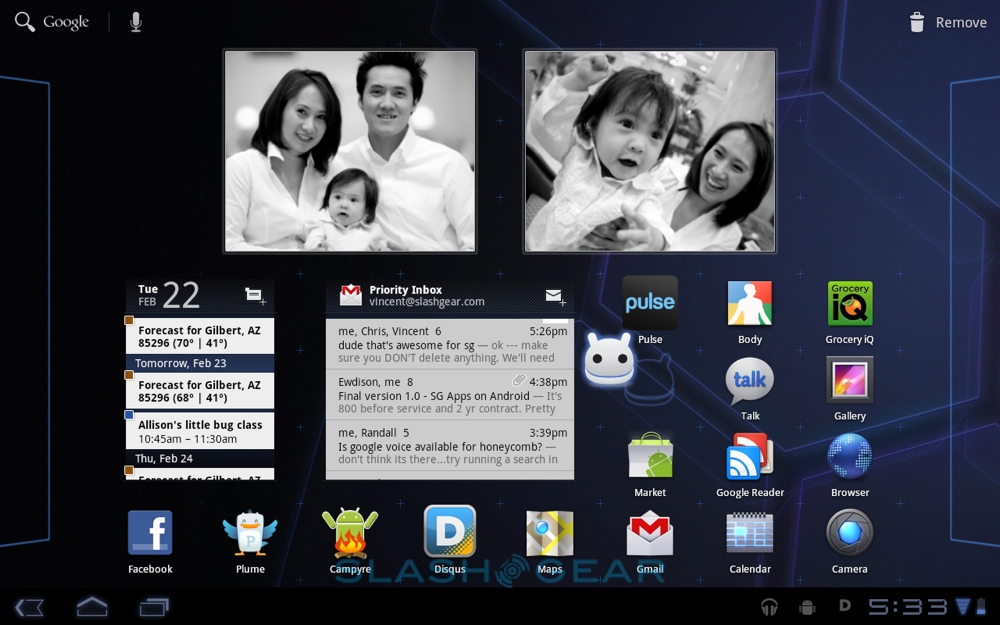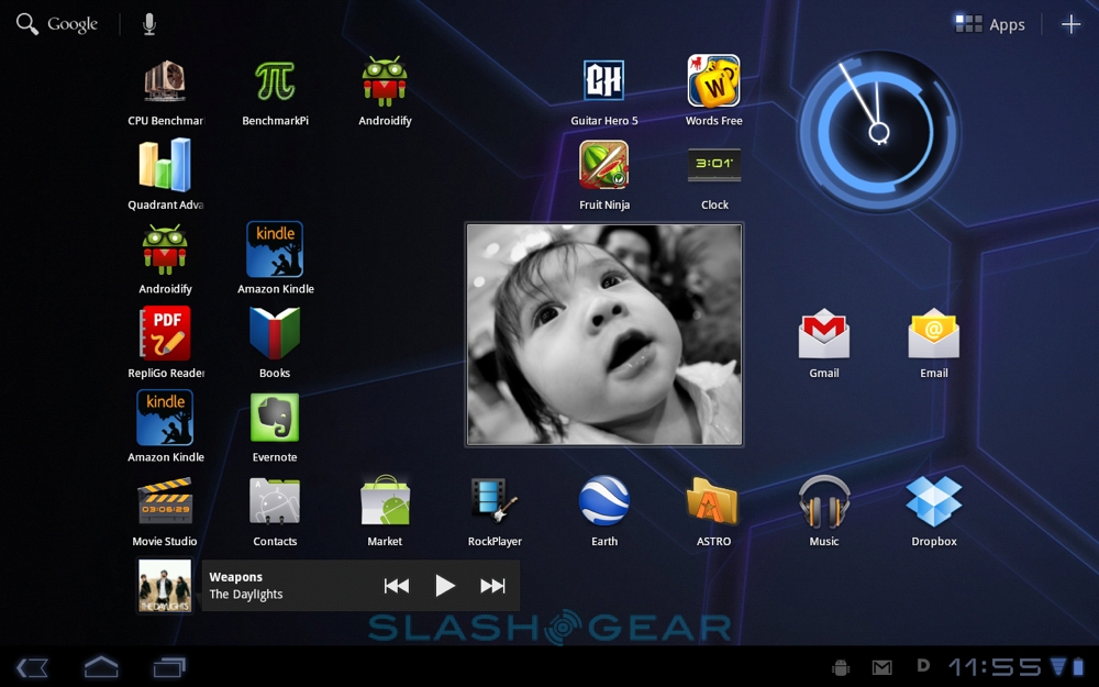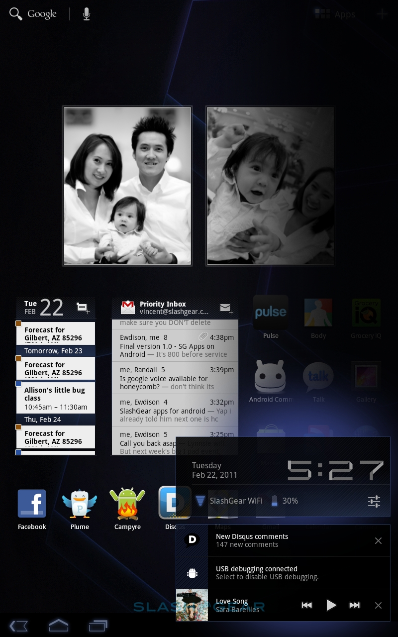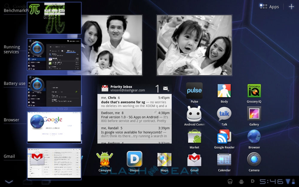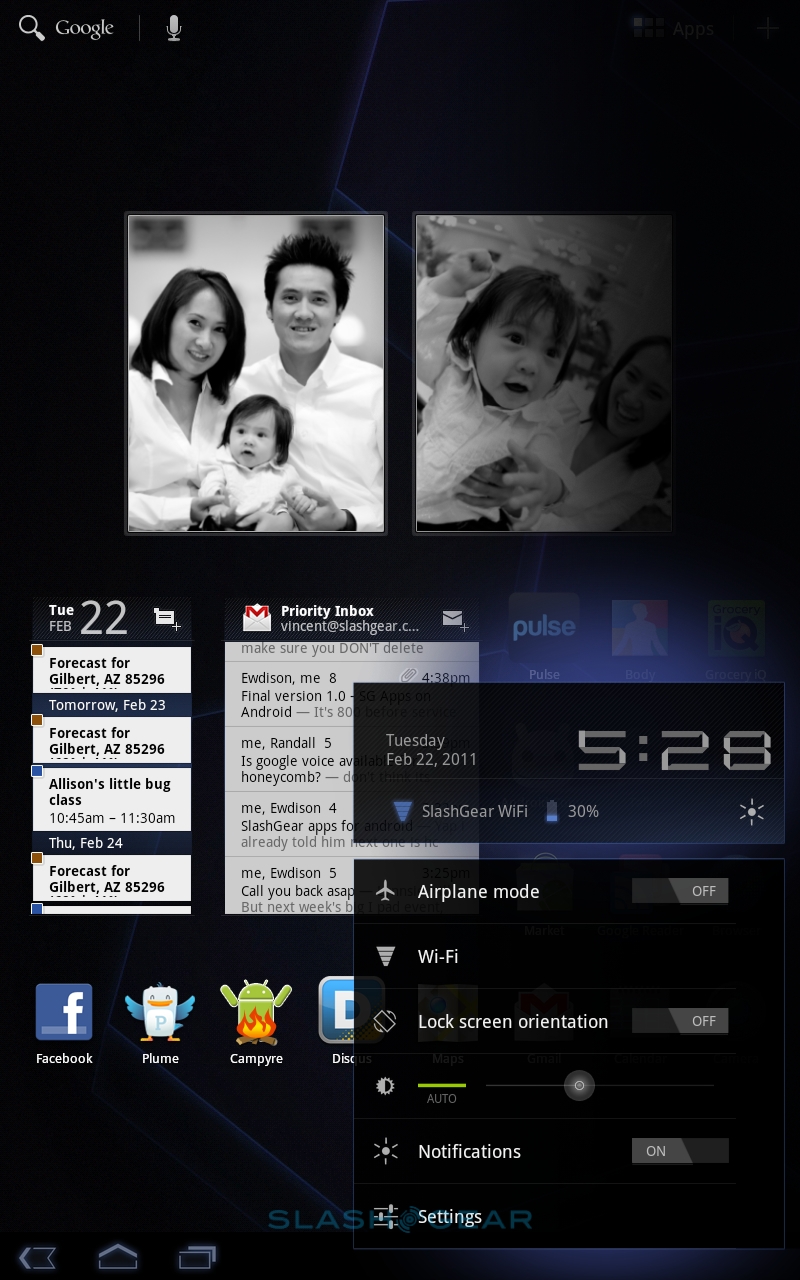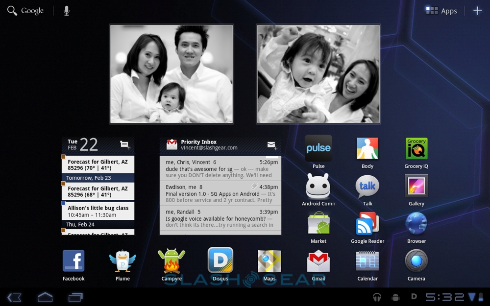 Android's UI has gradually evolved into the multi-desktop icon and widget layout we're used to on smartphones today, and Honeycomb pushes that paradigm to suit larger displays. The homescreen is a horizontally scrolling array of five panes, each accommodating an 8x7 grid of icons and widgets. As on handsets, the smallest icon is a 1x1 square, but various other sizes of widget are available, and usually offering greater interactivity than previously seen. So, for instance, the Gmail widget not only shows the most recent three messages (whether in your inbox or sorted by label) but can be scrolled to show older emails as well.