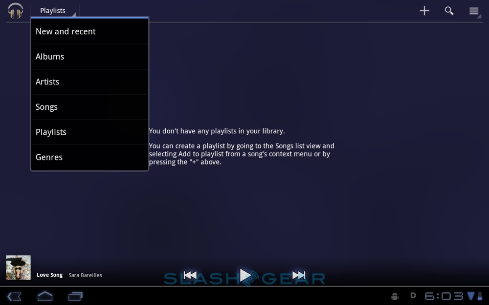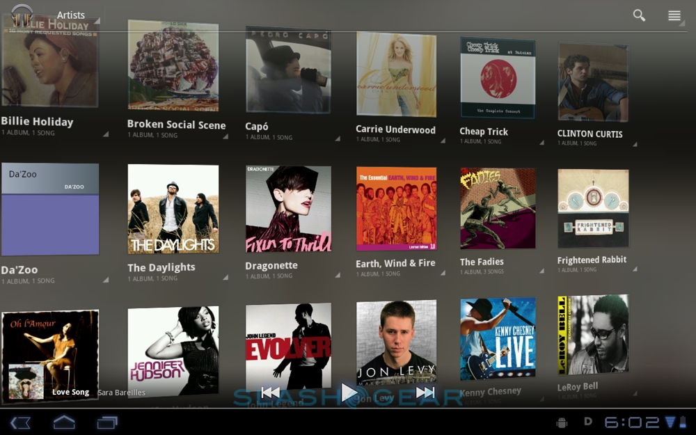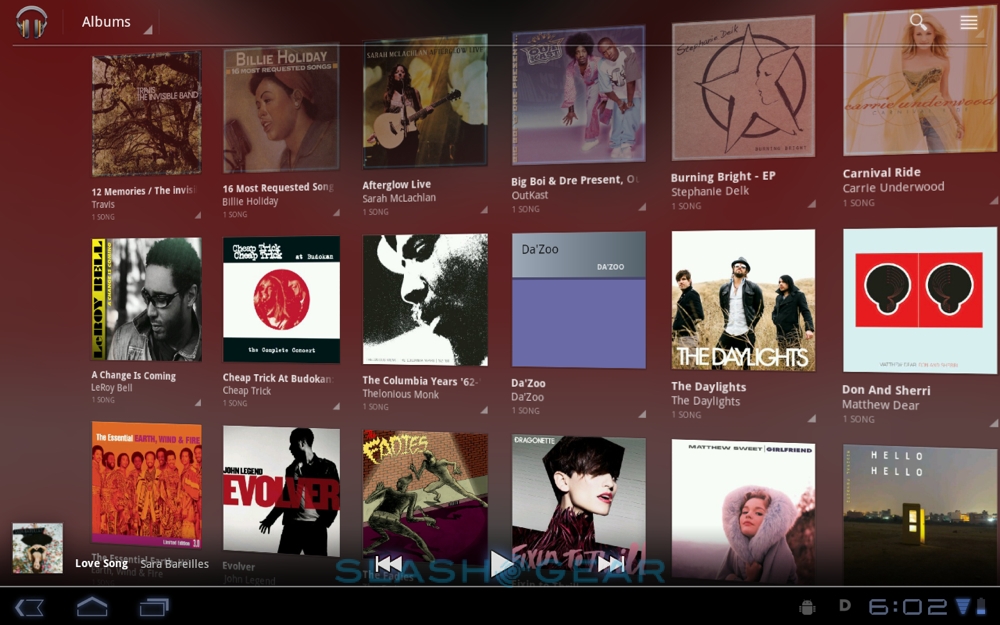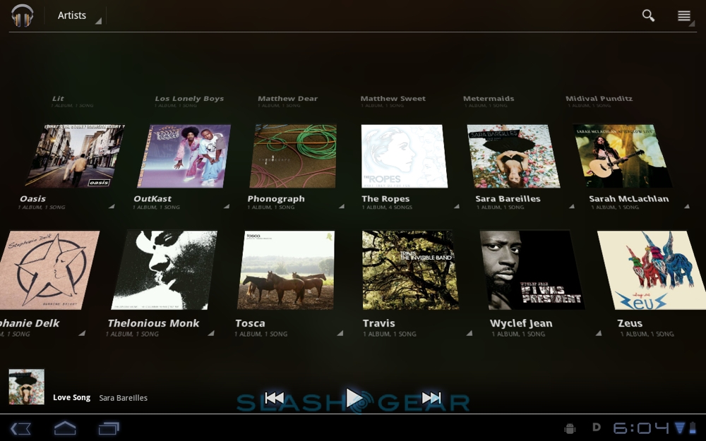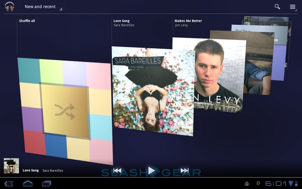 If the regular Android camera UI is unloved, then the music app has traditionally been even less appreciated. Happily Google's engineers have given it more than a fresh coat of paint for Honeycomb, with plenty of eye-candy that, thankfully, doesn't slow down actually browsing through tracks. There's a tilting, twisting 3D wall of albums and artists – flipped between with a drop-down menu in the top left corner – together with a New and Recent view with a timeline of the latest content you've loaded.