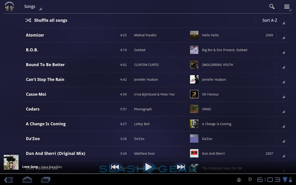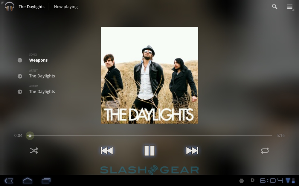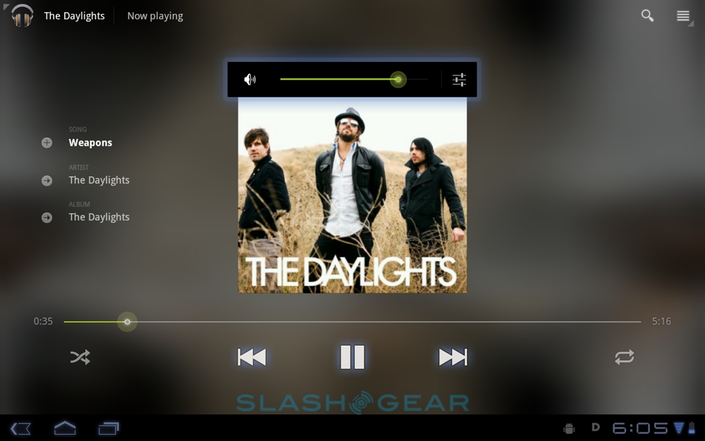 Android's notifications system has always been reasonably good, but the Honeycomb system is more comprehensive again. The extra screen space allows for more information in each alert, so messages and missed calls show caller ID as well as a contact photo if available, while music playing in the background has play/pause and track-skip controls so that you can navigate your tracklist without having to leave the app you're currently in. Notifications can be individually cleared, too, rather than Android 2.x's universal "Clear All" option. It's not as discrete as, say, webOS' system, but it's far preferable to iOS 4.x's clunky pop-up notifications on the iPad, and it fits in a lot more control and information than on the HP TouchPad.