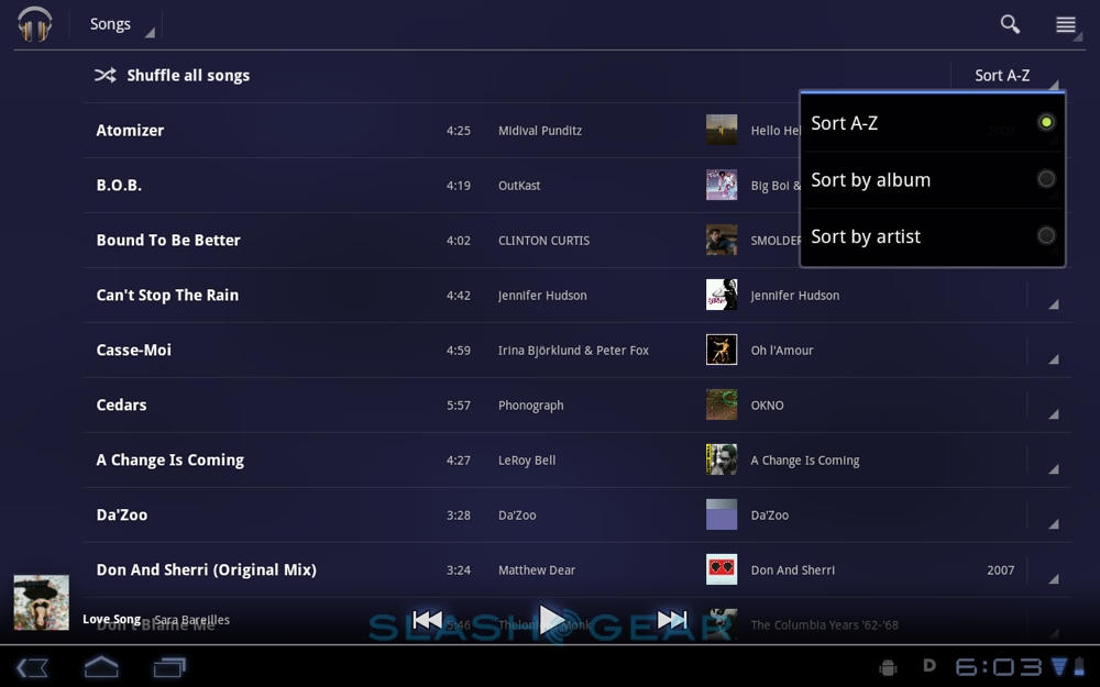 Alternatively there's a songs view – which presents tracks in a straightforward list, sorted alphabetically, by album or by artist – and a genre list, while you can also create playlists on your tablet. There are two ways of doing so: either by creating a blank playlist and then filling it with tracks, or by tapping the "Add to Playlist" option in any individual song's context menu. The now-playing screen shows album artwork, artist, title and album name, as well as a responsive scrub-bar and shuffle/repeat buttons.