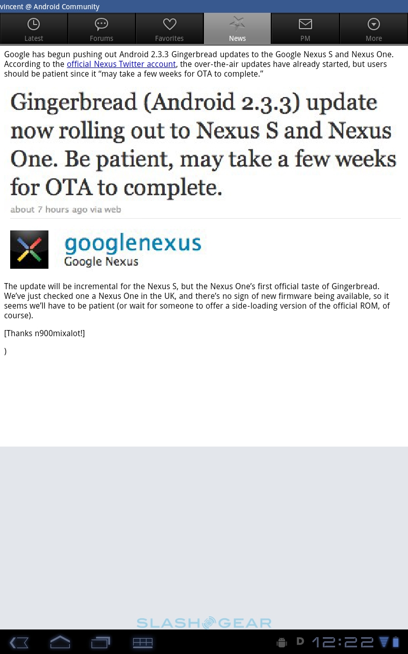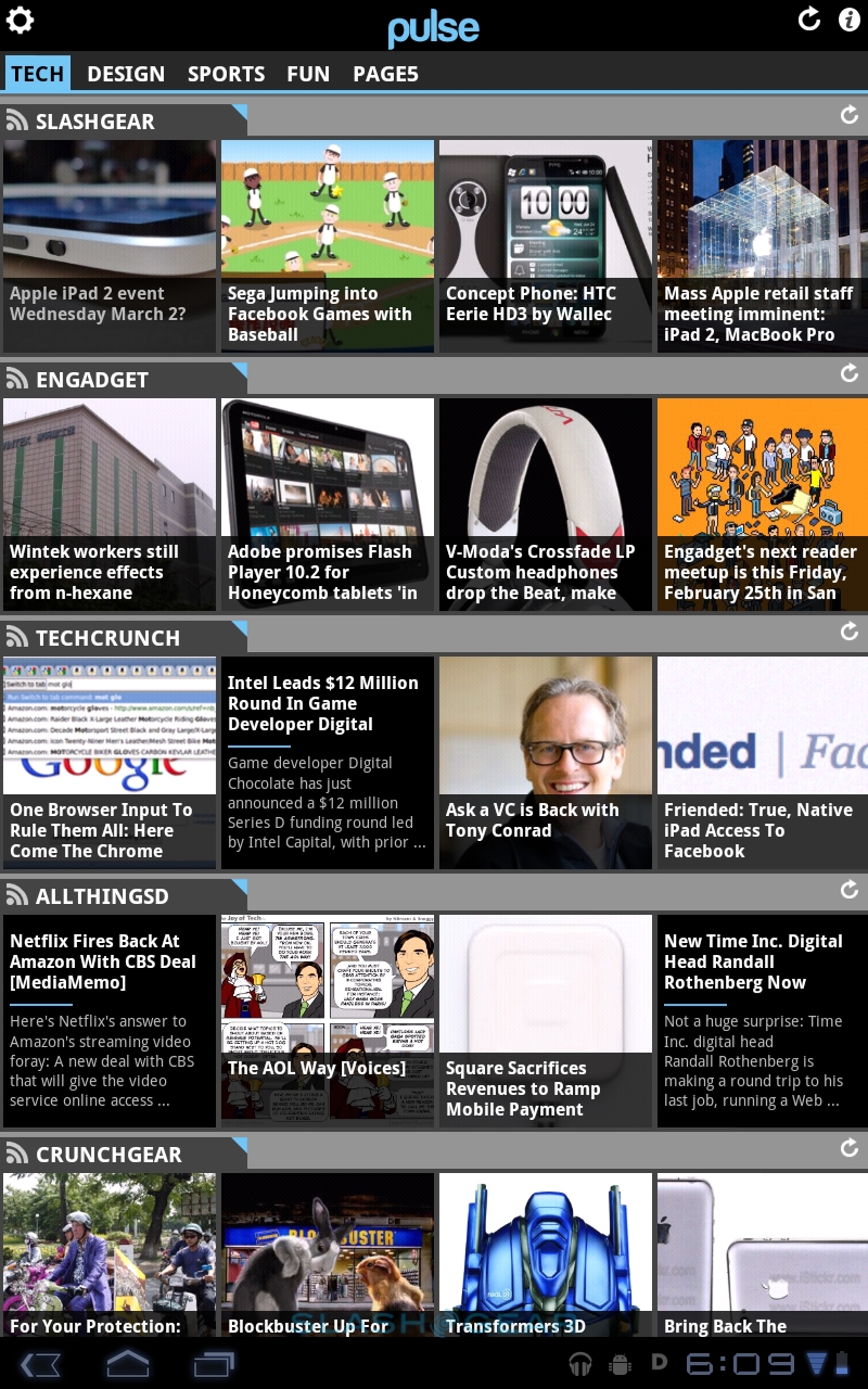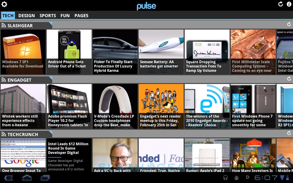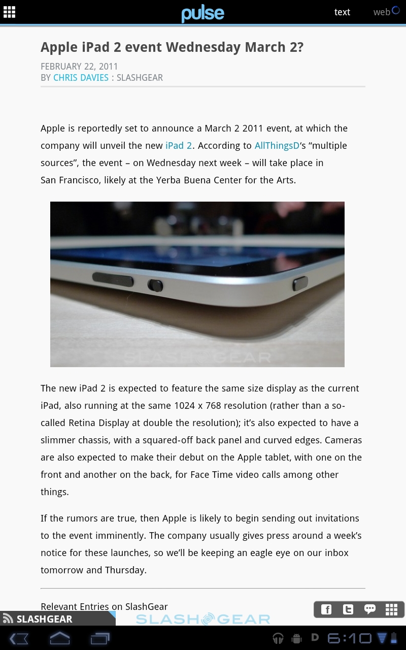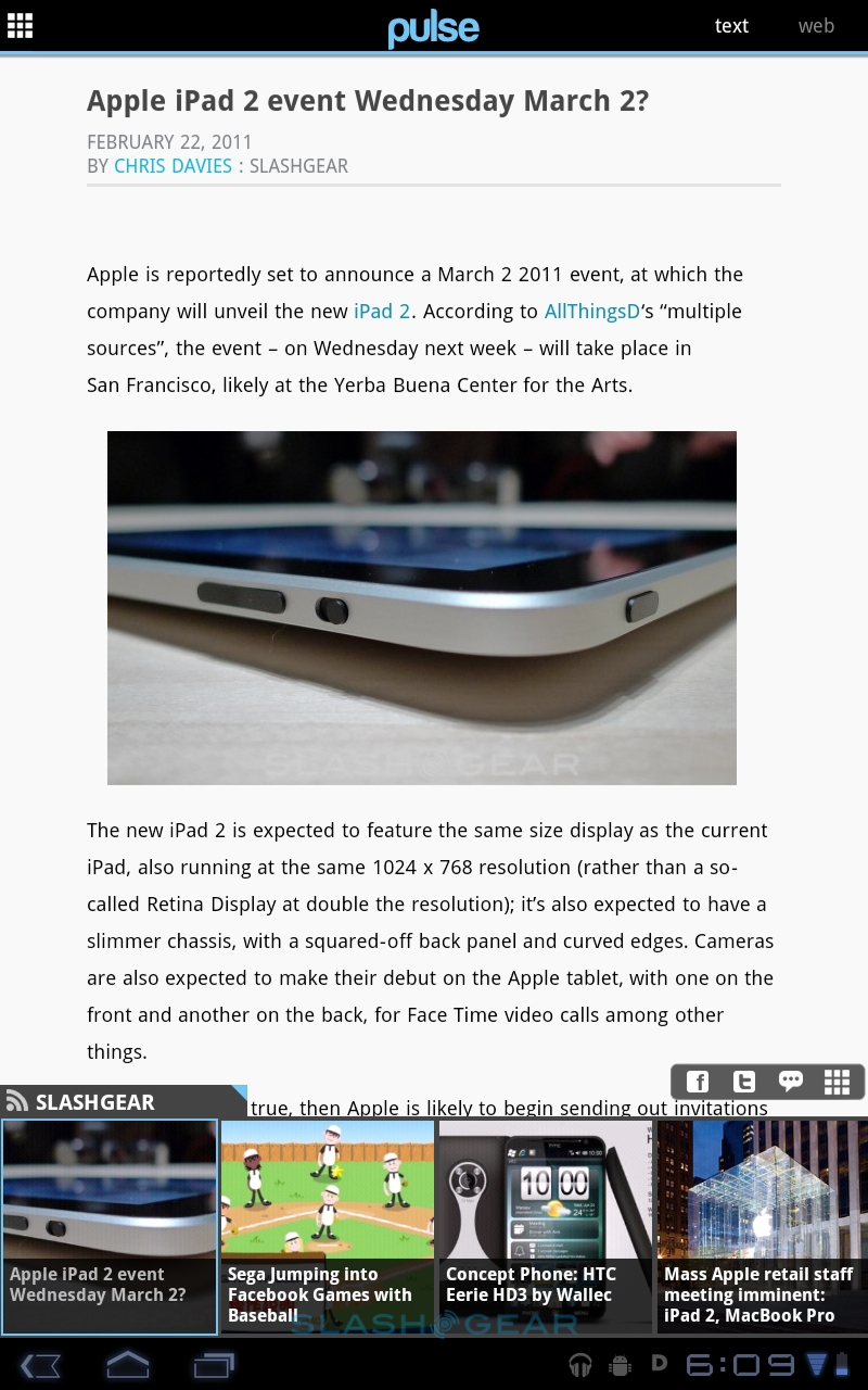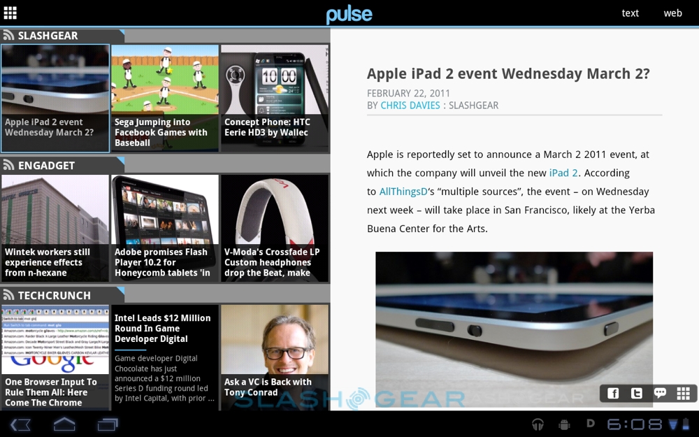 Pulse looks all but identical to the iOS version for iPad, with straightforward sharing tools that hook into Facebook, Twitter, email and other routes. However, it's actually a good example of Honeycomb's new Fragments addition to the API, which allows developers to build app UIs from multiple interchangeable and rearrangeable modular panes. In the case of Pulse, the preview window and the side-scrolling headline window are different fragments, with the blocks pieced together in different ways depending on whether you're reading in portrait or landscape orientation, or indeed on a smartphone or on a tablet. Fragments means developers will have to do less UI work to make apps that are usable on both platforms.