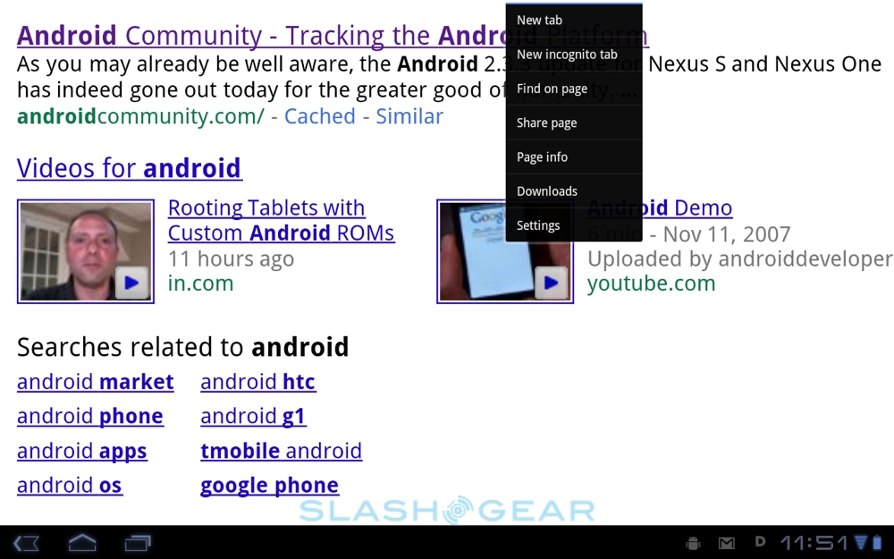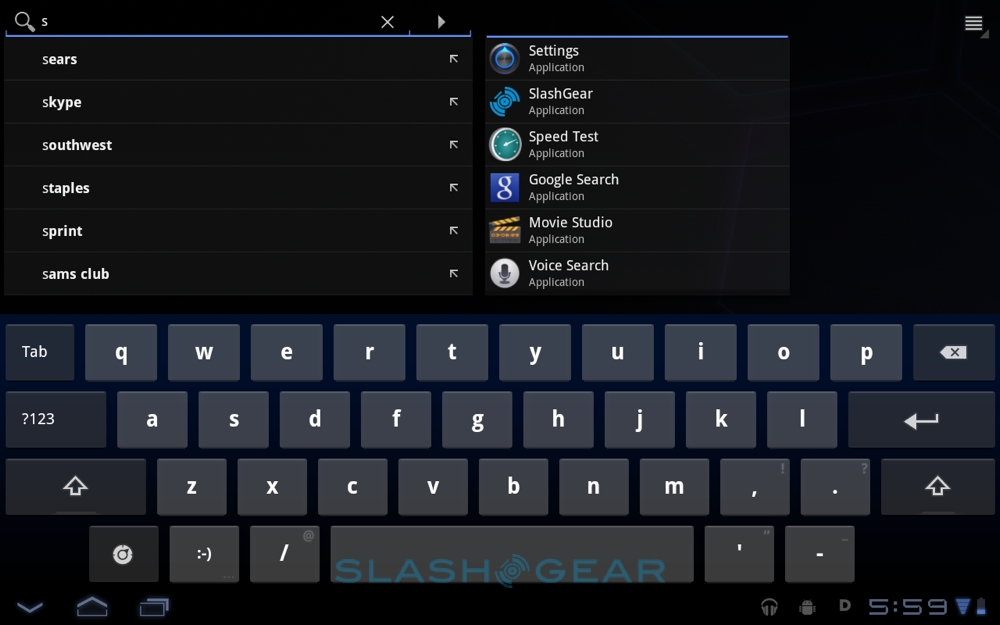 Searches themselves throw up results as you type, with a predicted list of auto-complete terms on the left and the apps, contacts, Google search and others on the right. On the XOOM's Tegra 2 processor there was no lag in waiting for results to arrive.