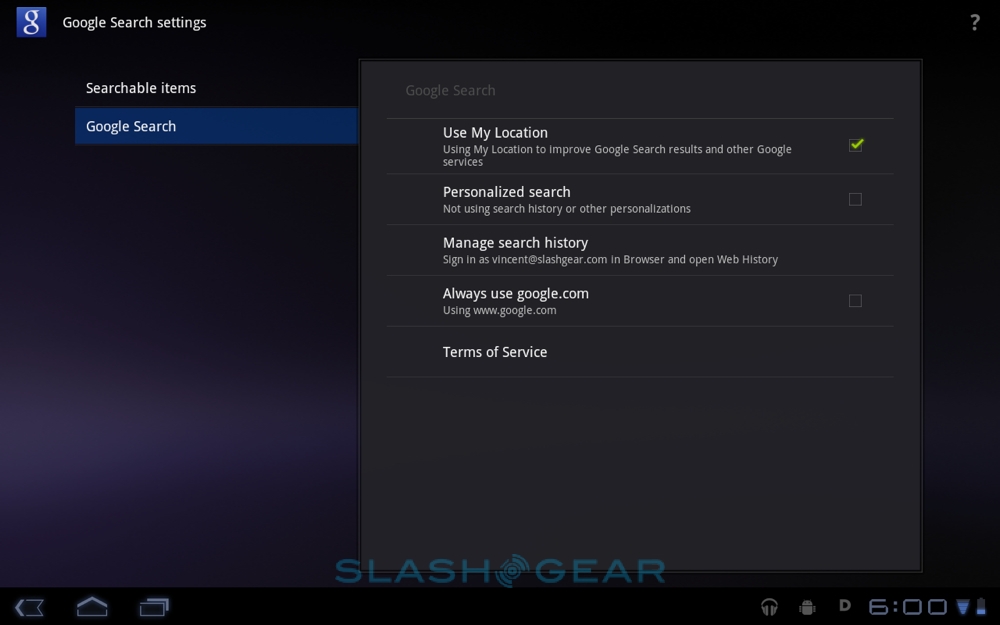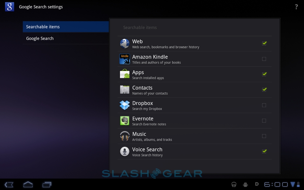 In most places, Google has stretched out the standard Android interface with some added extras. Searches, for instance, not only query your browser history, apps, contacts and music, but can look through third-party apps like your Kindle ebook library, Dropbox files and Evernote notes. Alternatively, you can tell Honeycomb not to search through any particular app, to bypass personalized searches, and whether or not to take into account your current location.