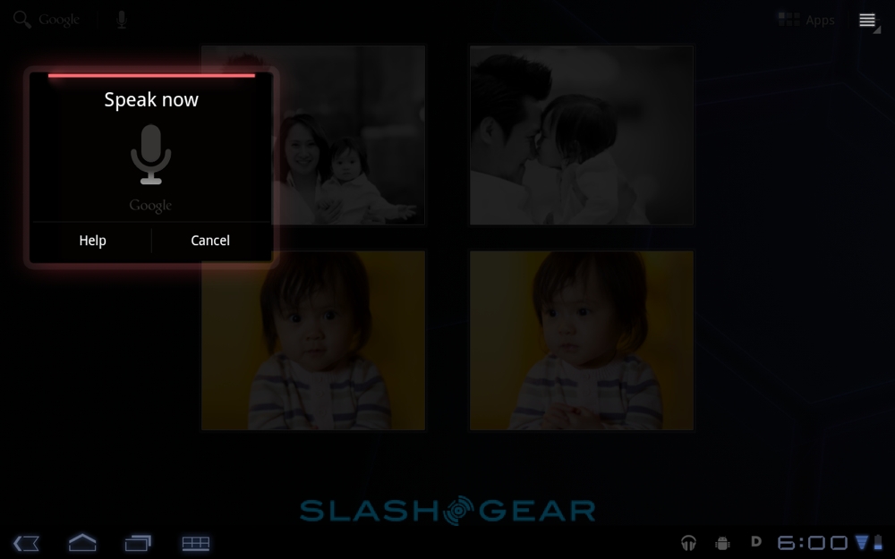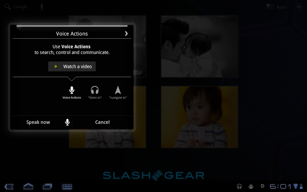 Voice Actions use the same system as on Android phones, and you can use the same natural commands to load apps as well as trigger basic searches. So, you can say "Listen to..." and then name an audio track for the media player to play, or "Navigate to... " and a destination for Google Maps to locate. As usual, the processing is done server-side, not on the Honeycomb tablet itself, and so you'll need a data connection if you want to use voice commands.