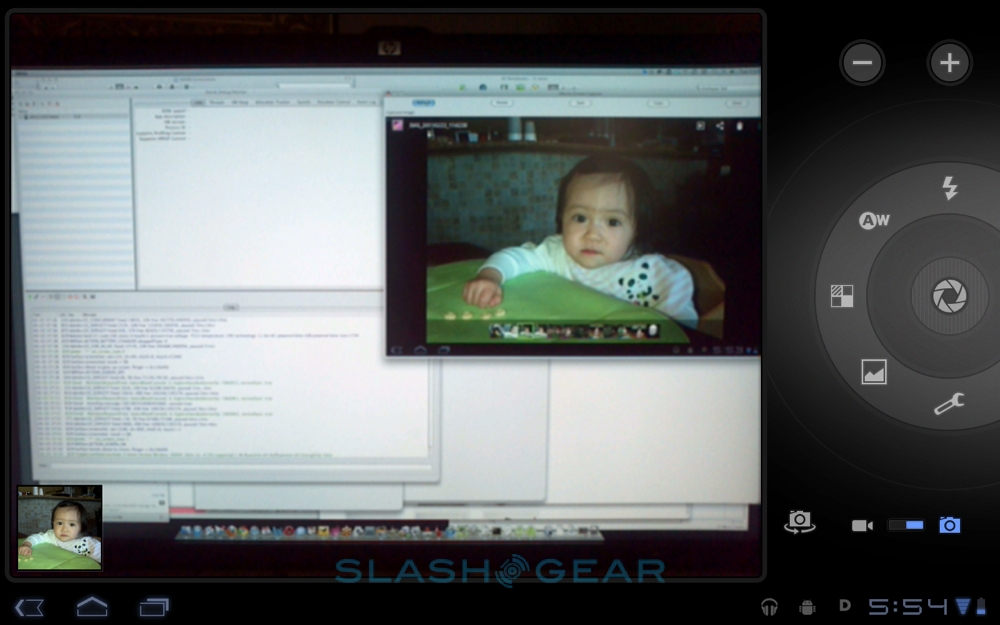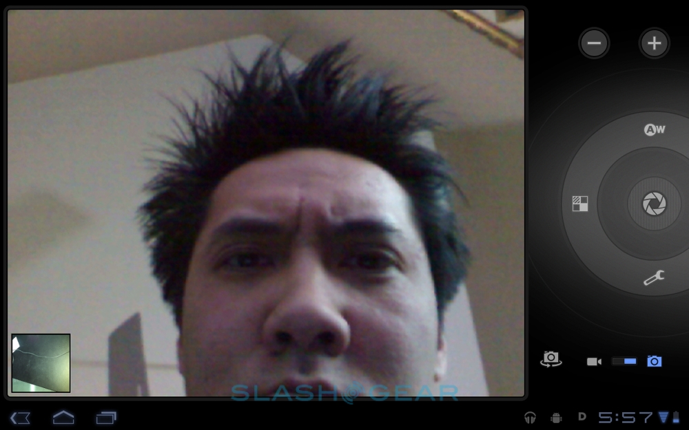 Android's smartphone camera UI is one of the less successful interfaces, so we're glad to see Google bringing Honeycomb up to date with a refreshed layout and controls. The preview window dominates the screen, with the controls clustered on the right hand side of the display. Zoom buttons are at the top, with a button to flip between front and rear cameras, and a toggle for photos or videos, at the bottom.