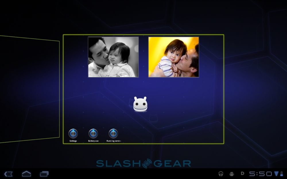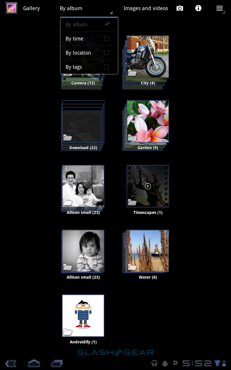 Image quality will of course depend on the camera itself, but browsing stills and video is a more enjoyable experience thanks to the updated gallery. As usual there's a folder view, splitting shots up into those downloaded, those taken with the camera and any particular sets you've set up yourself. Tapping into them gives you a full-screen view and a smaller timeline of shots along the bottom, which scrolls along in a suitably silky manner. Up on the action bar there are buttons to kick start a slideshow – useful if you've got a dock or stand of some sort – along with the Android sharing button to send out the current image via email, message or another route. If you have an Android 3.0 Honeycomb tablet with an HDMI connector – like the XOOM – then you can hook up the slate to your HDTV and browse content on the big screen. There's a mirroring option that replicates the display on both the touchscreen and the external screen for easier control.