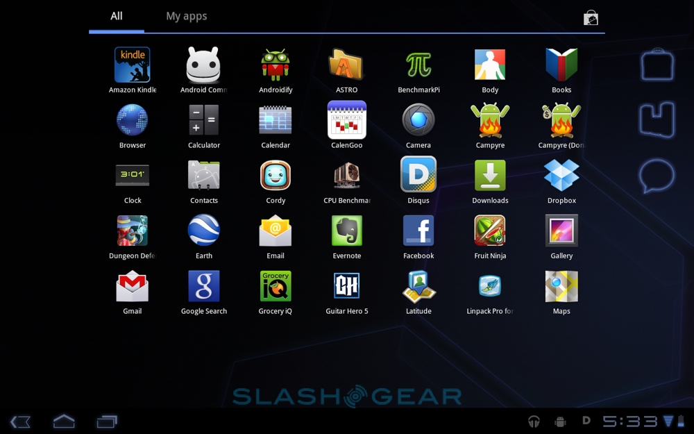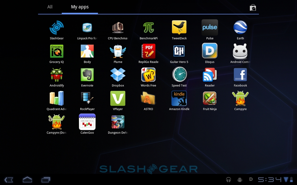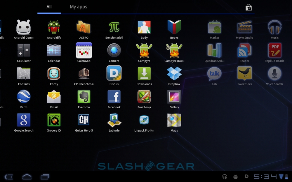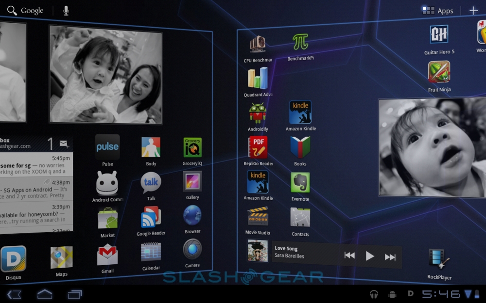 Everything is wrapped up in a slick, elegant theme, which doesn't dumb down the tablet experience but which isn't unduly intimidating for the first-time user. Buttons pop up as you need them and dash away when you don't, and the consistency between apps – even third-party titles, more on which later – should silence many previous criticisms of Android feeling disjointed in comparison to iOS. Animations and effects are neat, without delaying navigation, and there are little touches – like icons leaving their exact outlines behind when you're dragging them around the homescreen – which show Google has paid real attention to the overall feel of Honeycomb.