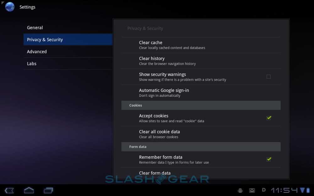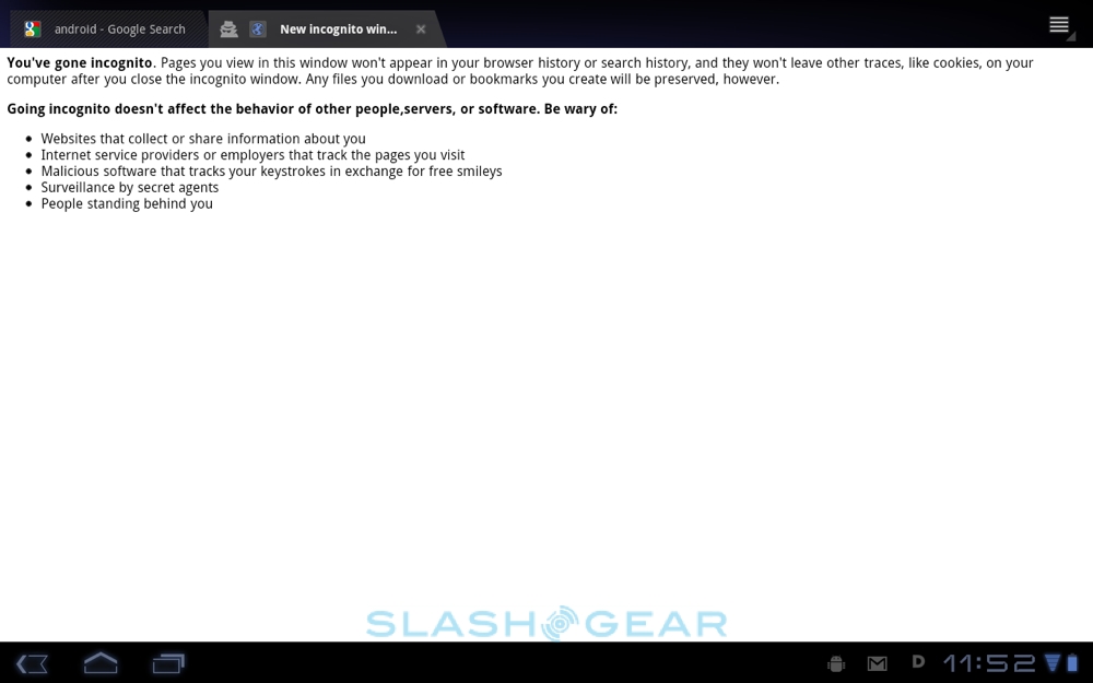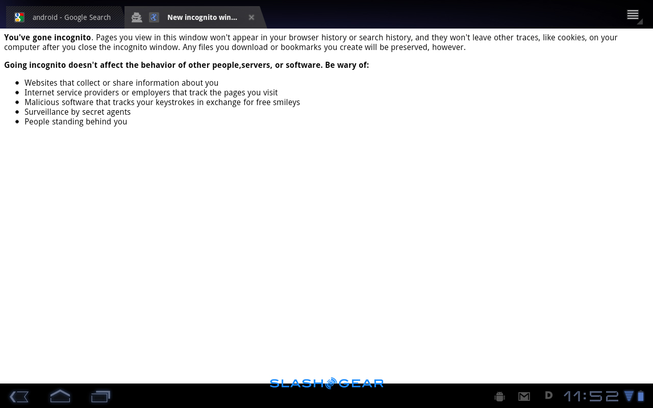 Private browsing with "Incognito" windows is supported, bypassing the combined bookmarks and history pane (as well as cookies), and there's the option for bookmark synch with Google's Chrome browser. There's also the option to automatically sign into pages requiring Google credentials using the user ID and password Android has on file, which can save time (though isn't much use if, say, you have separate Google accounts for business and home).