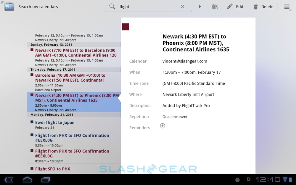 Like the email apps, the Honeycomb Calendar has been boosted to take advantage of the larger screen size. In day and week views, a pinch-zoom gestures changes the grid layout; multiple calendars can be synchronized with a single view. Even with a week's layout on-screen, there's still room for a date-grid for the entire month, with the different calendars listed underneath (and easily toggled on and off). It works just as you'd expect from Google Calendar in the browser. The one odd omission is an agenda view, all the more surprising given that calendar search results are pulled into a brilliant, comprehensive list with pop-out details. We're not sure why Google didn't offer this list as an alternative view.