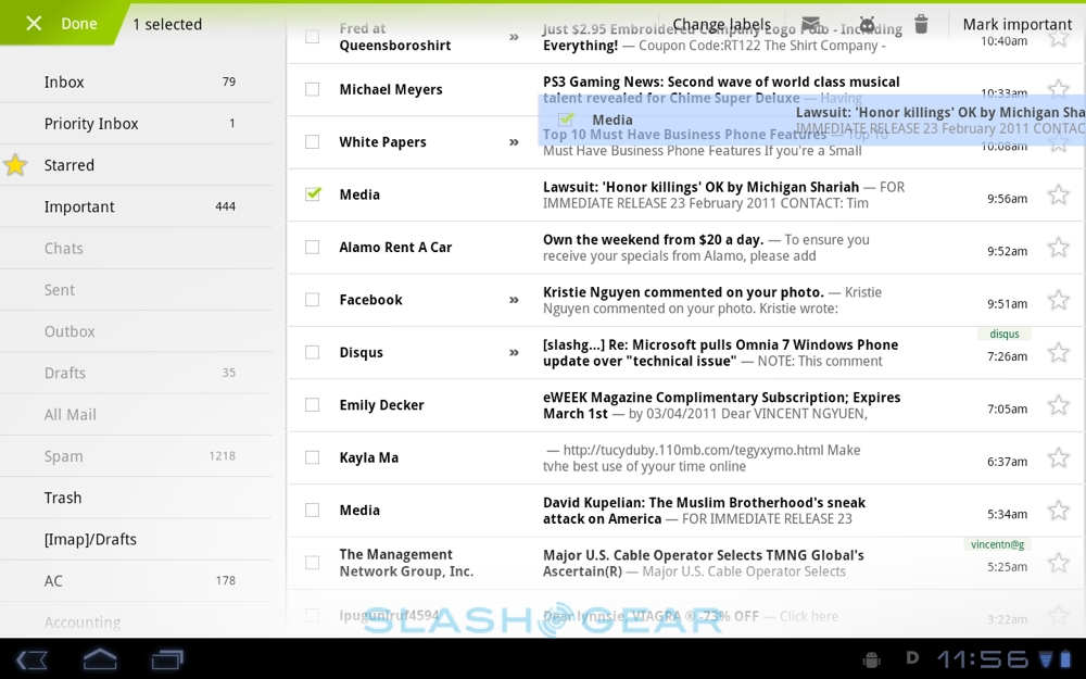 Liberal use of folders and labels is made, and there's now drag & drop support for pulling messages out assigning them to the different categories. Any sort of jerkiness or lag would be a real issue here, but thankfully Honeycomb coasts along slickly with no problems whatsoever. You can use both apps simultaneously, of course. Altogether it's one of the best interpretations of email on a tablet device that we've seen, bringing across some common-sense desktop behaviors but not losing the finger-friendliness a slate demands.