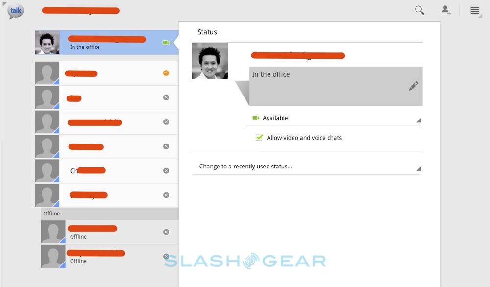 New with Honeycomb is Google Talk support for video calls as well as IM conversations, taking advantage of front-facing cameras such as the Motorola XOOM's 2-megapixel webcam. Individual contacts can be placed on the homescreen, with indicators showing their GTalk status. Calls are initiated from a text conversation; hit the camera icon and the video call rings.